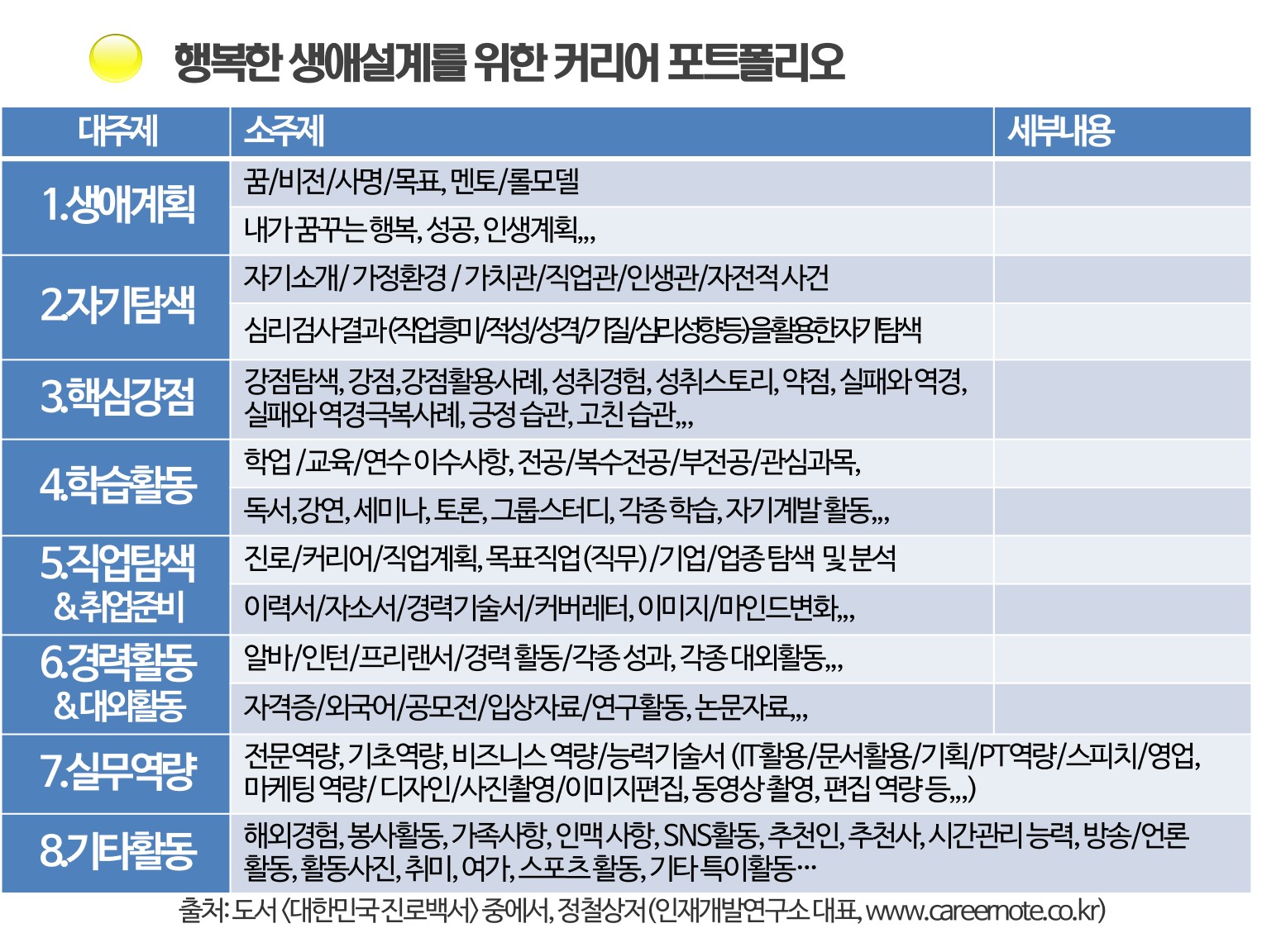 각 항목을 구성하는 내용은 다음과 같을 수 있다. 이를 참조하여 자기만의 멋진 ‘커리어 포트폴리오’를 완성해보자.