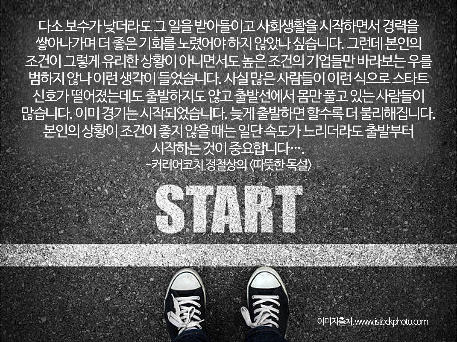 그러니까 어느 분야에 지원하던 중요한 것은 경력을 쌓으며 일을 시작해야 한다는 겁니다. 그런데 한 기업에 채용되고도 연봉 2400만원 준다는 말에 취업을 포기했다는 말에 안타까운 마음이 들었습니다. 다소 보수가 낮더라도 그 일을 받아들이고 사회생활을 시작하면서 경력을 쌓아나가며 더 좋은 기회를 노렸어야 하지 않았나 싶습니다. 그런데 본인의 조건이 그렇게 유리한 상황이 아니면서도 높은 조건의 기업들만 바라보는 우를 범하지 않나 이런 생각이 들었습니다. 사실 많은 사람들이 이런 식으로 스타트 신호가 떨어졌는데도 출발하지도 않고 출발선에서 몸만 풀고 있는 사람들이 많습니다. 이미 경기는 시작되었습니다. 늦게 출발하면 할수록 더 불리해집니다. 본인의 상황이 조건이 좋지 않을 때는 일단 속도가 느리더라도 출발부터 시작하는 것이 중요합니다.