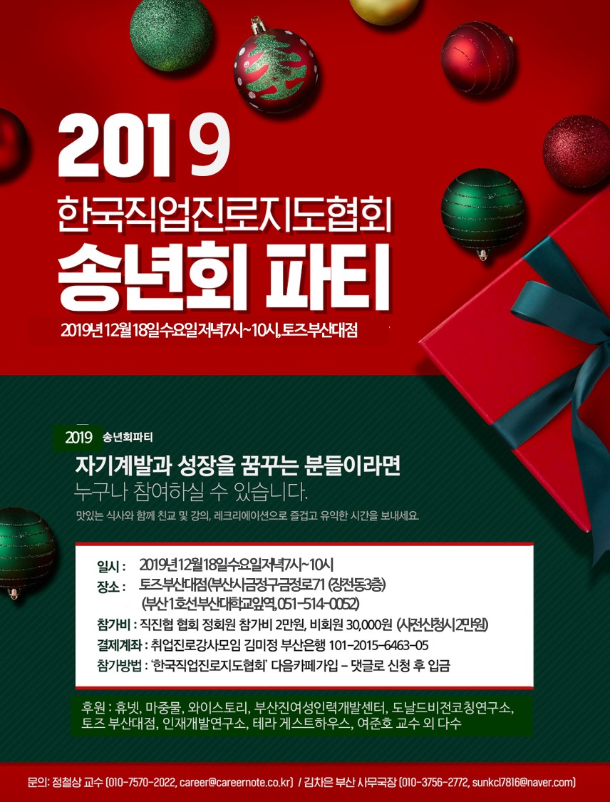 지금까지 6년 동안 한 번도 안 빠지고 매년 송년회 파티를 개최해왔는데요. 매년 재미와 의미라는 두마리 토끼를 모두 잡아왔답니당^^ 협회 회원이 아니라도 진로와 자기성장에 관심 있는 분들이라면 누구나 참여가 가능한 오픈 행사이니 마음 편히 신청하시면 됩니다. 가까운 지인이나 가족 분들과 함께 오셔도 부담없이 즐길 수 있는 멋진 시간 되실 겁니다. 올해 송년회 행사 역시 배움과 자연스러운 교제를 할 수 있는 행복한 모임될 겁니다.