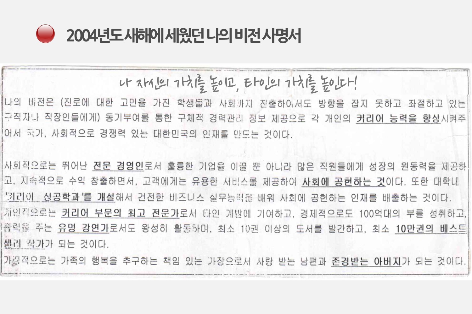 ‘은퇴해서 편안히 쉬는 삶을 목표로 하기보다는 죽는 날까지 나 스스로를 계발하고, 죽어서도 타인의 가치를 높일 수 있는 일을 해내겠다’는 나의 의지가 담겨 있다. 이 비전에는 부족한 나 자신의 능력을 지속적으로 계발해나가면서, 과거에 겪었던 깨달음을 조금이나마 다른 사람들에게 전수해주어 많은 사람들의 가치도 높이겠다는 자아실현의 소망이 담겨 있다.