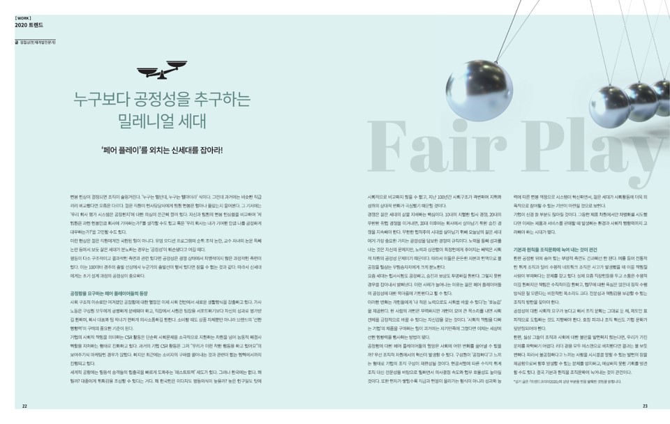사회구조적 이슈로만 여겨졌던 공정함에 대한 열망은 이제 사회전반에서 새로운 생활양식을 창출하고 있다. 가사 노동은 구성원 모두에게 공평하게 분배돼야 하고, 학생들은 조별과제보다 개인과제를 선호한다. 직장에서는 팀장님을 서포트하기보다 나 자신의 성과로 평가받길 원하며, 회사 대표와 팀 막내가 편하게 의사소통하길 원한다. 소비할 때도 상품 자체뿐만 아니라 그 브랜드의 올바른 ‘선한 영향력’이 구매의 중요한 기준이 된다.