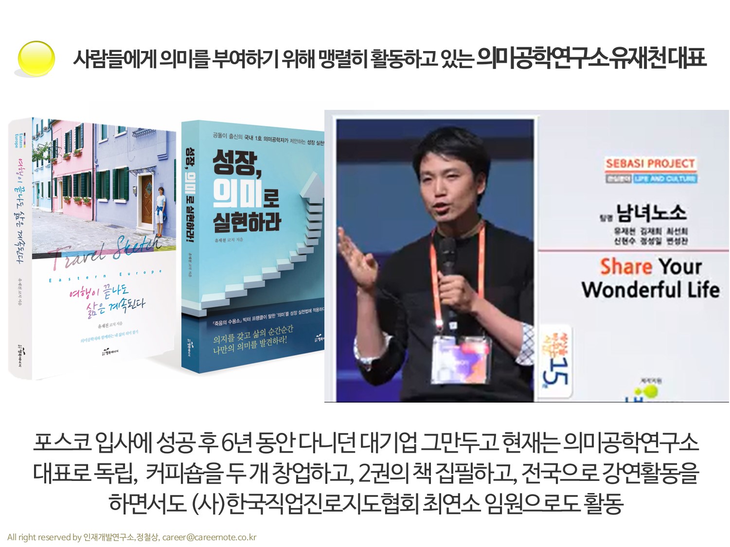 저서: <아보카도 심리학>, <대한민국 진로백서>,<서른번 직업을 바꿔야만 했던 남자>, <가슴 뛰는 비전>