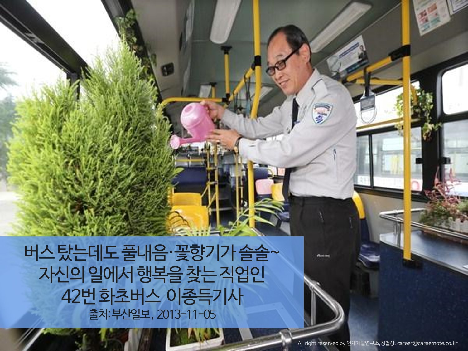 부산에서 ‘화초버스’로 널리 알려진 42번 버스를 운행하는 이상득 기사의 일화도 유명하다. 그는 승객들을 기쁘게 하려고 개인 돈을 들여 버스를 화초로 꾸몄다. 버스를 꾸미는 효과도 있지만, 급정거를 하지 않으려는 다짐이기도 했다. 그런 노력 덕분에 10년 넘게 ‘친절 버스기사’로 선정됐다.