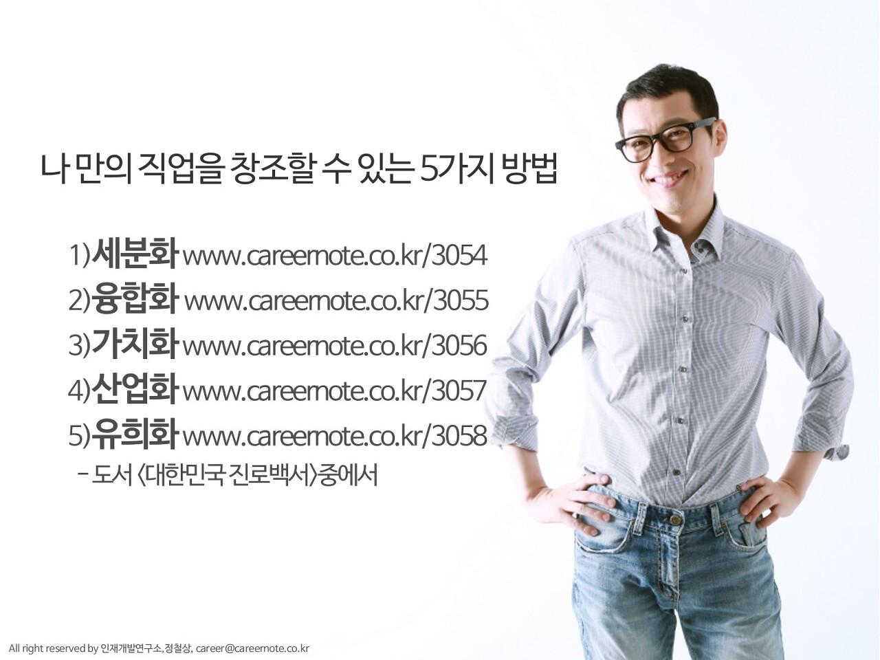 저서: <대한민국 진로백서>,<서른번 직업을 바꿔야만 했던 남자>, <심리학이 청춘에게 묻다>, <가슴 뛰는 비전>