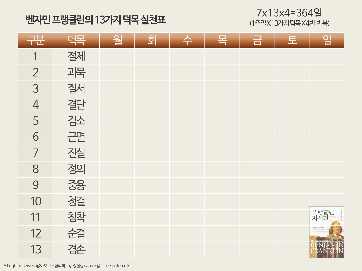 이 덕목을 실천하기 위해 다음과 같은 도표를 만들어 실천해볼 수 있겠다. 나는 1년을 꼬박 실행했는데, 1주일에 이 13가지 덕목을 4번 반복하면 총364일이 나온다. 나도 모르게 습관으로 자리 잡기 마련이다.
