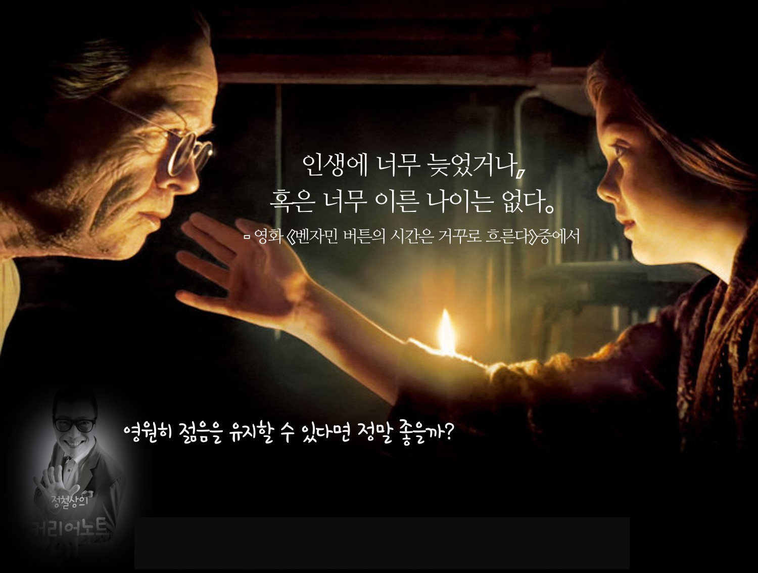 그러나 이 영화는 젊어진다는 것이 또 한편으로는 재앙이 될 수도 있음을 극명하게 보여준다. 주인공 벤자민 버튼(브래드 피트)은 갈수록 더 어려지는데 사랑했던 여인 데이지(케이트 블란쳇)가 점점 늙어가는 모습을 통해 ‘자연스럽게 늙어간다는 것이 얼마나 큰 삶의 축복인가’ 하는 감사함마저 일깨운다.