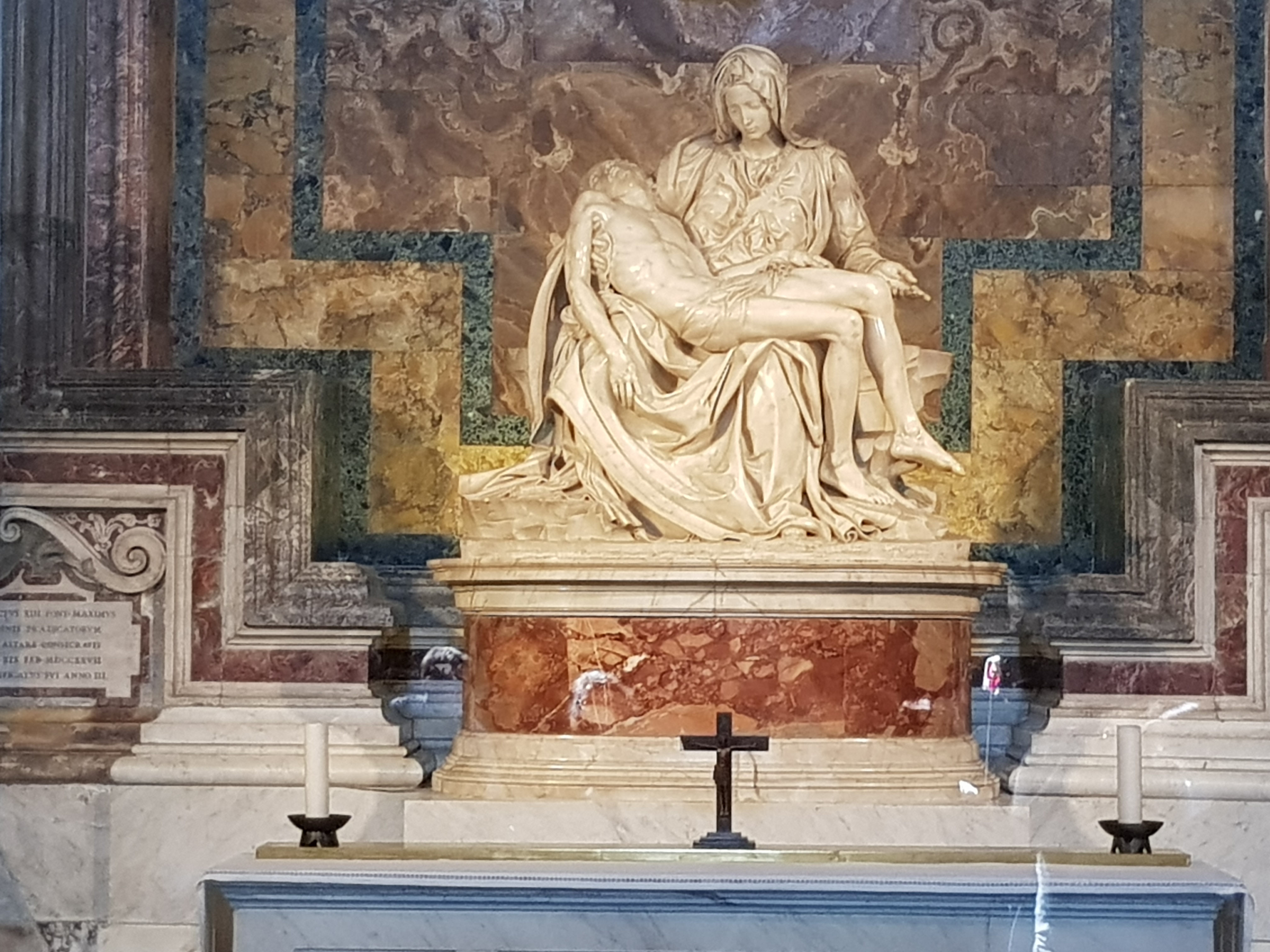 그러나 미켈란젤로의 피에타는 기존의 그 어떤 피에타보다도 예수님과 성모 마리아의 자애어린 사랑을 잘 함축한 위대한 작품입니다. 그래서 이제는 ‘피에타’ 하면 미켈란젤로의 피에타만 떠올릴 정도입니다. 미켈란젤로의 피에타는 측면의 어떤 방향에서 보더라도 아름답지만 하늘에서 아래로 바라볼 때 두 눈을 감은 예수님의 모습이 평온하게까지 느껴진다는 겁니다. 그렇지만 밑에서 관람해야 하는 관람객들 입장에서는 그 표정이 보이기 않기에 ‘왜 예수님의 표정이 보이지 않느냐’고 비판하는 평론가들도 있었습니다. 하지만 미켈란젤로는 이 피에타는 사람들에게 바치는 조각품이 아니라 하느님에게 바쳐진 선물이기 때문에 그러했다는 겁니다. 기존의 성모 마리아는 아들을 잃어서 슬퍼하는 장면이었는데요. 미켈란젤로의 피에타는 예수님이 모든 것을 이루고 하늘나라로 아들을 잃어서 슬퍼하는 모습은 맞지 않는다며 잠든 아이를 바라보는 어머니처럼 사랑이 넘치는 자애로운 표정이라는 겁니다.