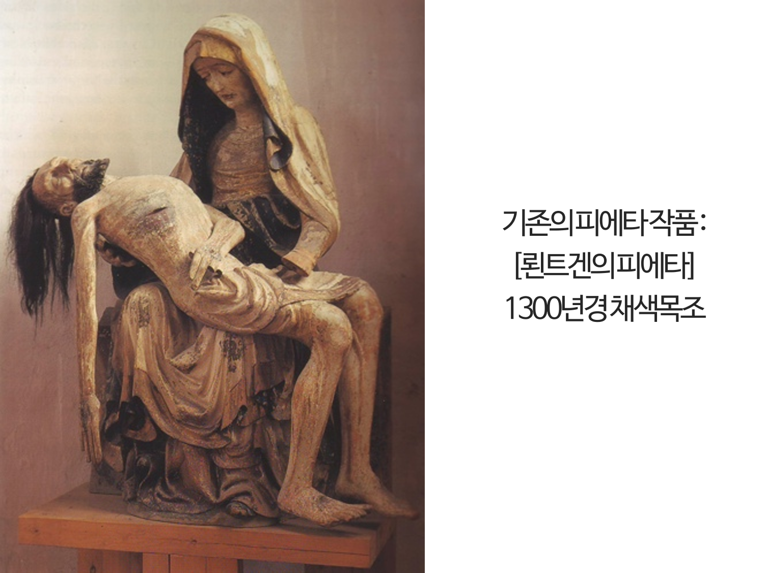 그러다보니 20대인 나이에도 그의 조각작품은 놀라운 수준이었습니다. 그 자신도 그러한 자신의 재능을 알고 있었을 겁니다. 그래서 24살의 젊은 나이에 피에타라는 조각을 만드는데요. 사람들이 자신을 칭송할 거라고 잔뜩 기대합니다. ‘피에타’는 통상 성모 마리아가 돌아가신 예수를 끌어안고 있는 작품을 말합니다. 피에타는 미켈란젤로 이외에도 기존에 여러 작품들이 많은데요.
