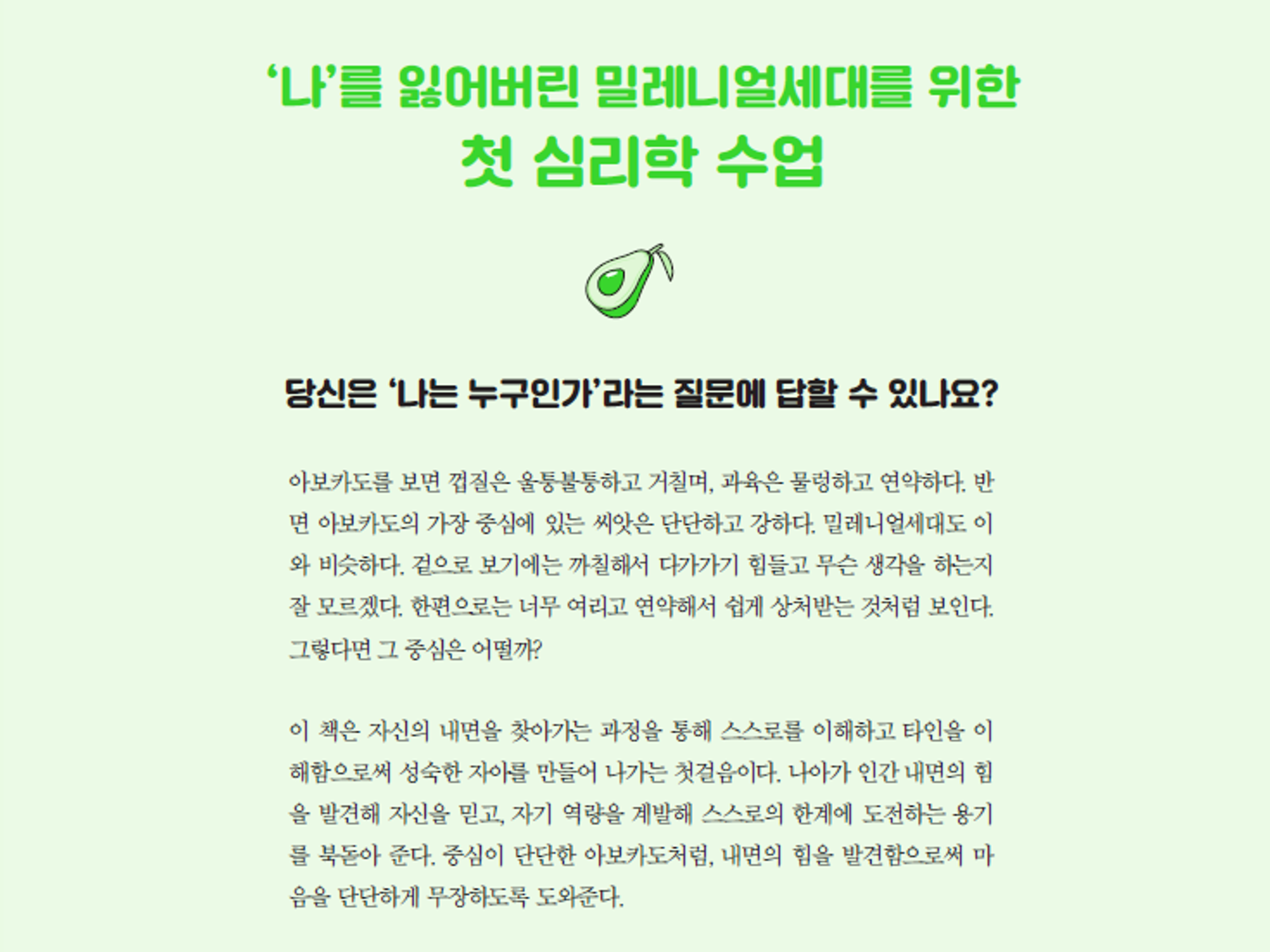 아보카도처럼 까칠해서 다가가기 힘들고 여려서 쉽게 상처받는 밀레니얼, 그 마음도 아보카도 씨앗처럼 단단할까? 이 책은 ‘나’를 찾아가는 과정을 통해 스스로를 이해하고 타인을 이해함으로써 성숙한 자아를 만들어 나가는 첫걸음을 제시한다.