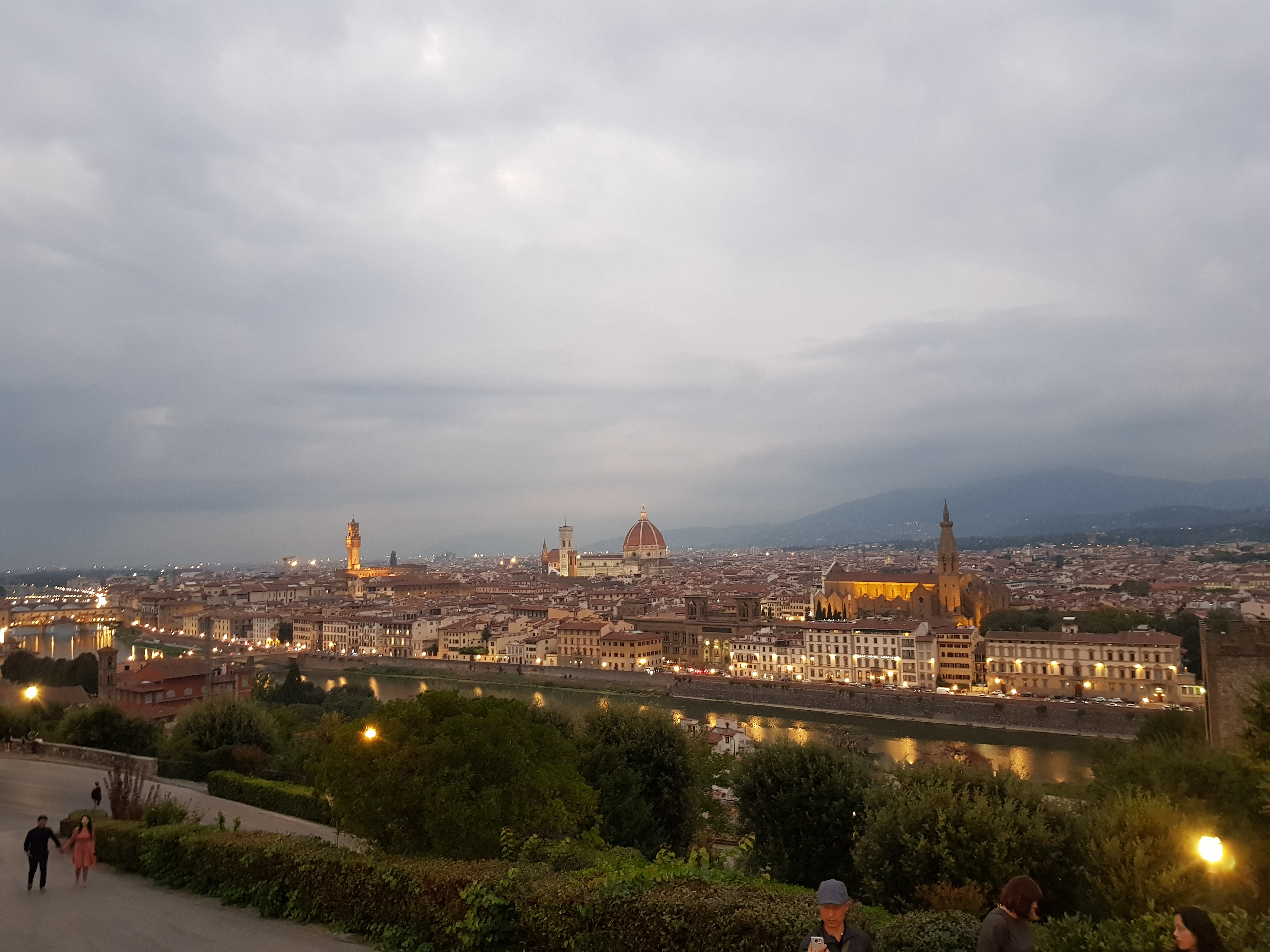 저희 가족은 해가 지기 전에 올라 해가 질 때까지 2시간가량 정말 아무 것도 안 하고 피렌체 전경만 바라다봤는데요. 해가 떠 있을 때도 붉은 지붕들이 단풍에 물든 듯한 피렌체의 아름다움을 보여주더니, 해가 진후에도 별빛이 내려앉은 듯한 피렌체의 또 다른 모습을 보여줍니다. 보는 내도록 두 눈 뿐만 아니라 온 몸과 마음의 감각들이 다 호강하는 느낌이 들 정도로 세포의 모든 감각들이 다 일어나는 느낌이었습니다. 그러면서도 차분하고 고요한 안정감을 주어서 무척 평화로웠답니다.