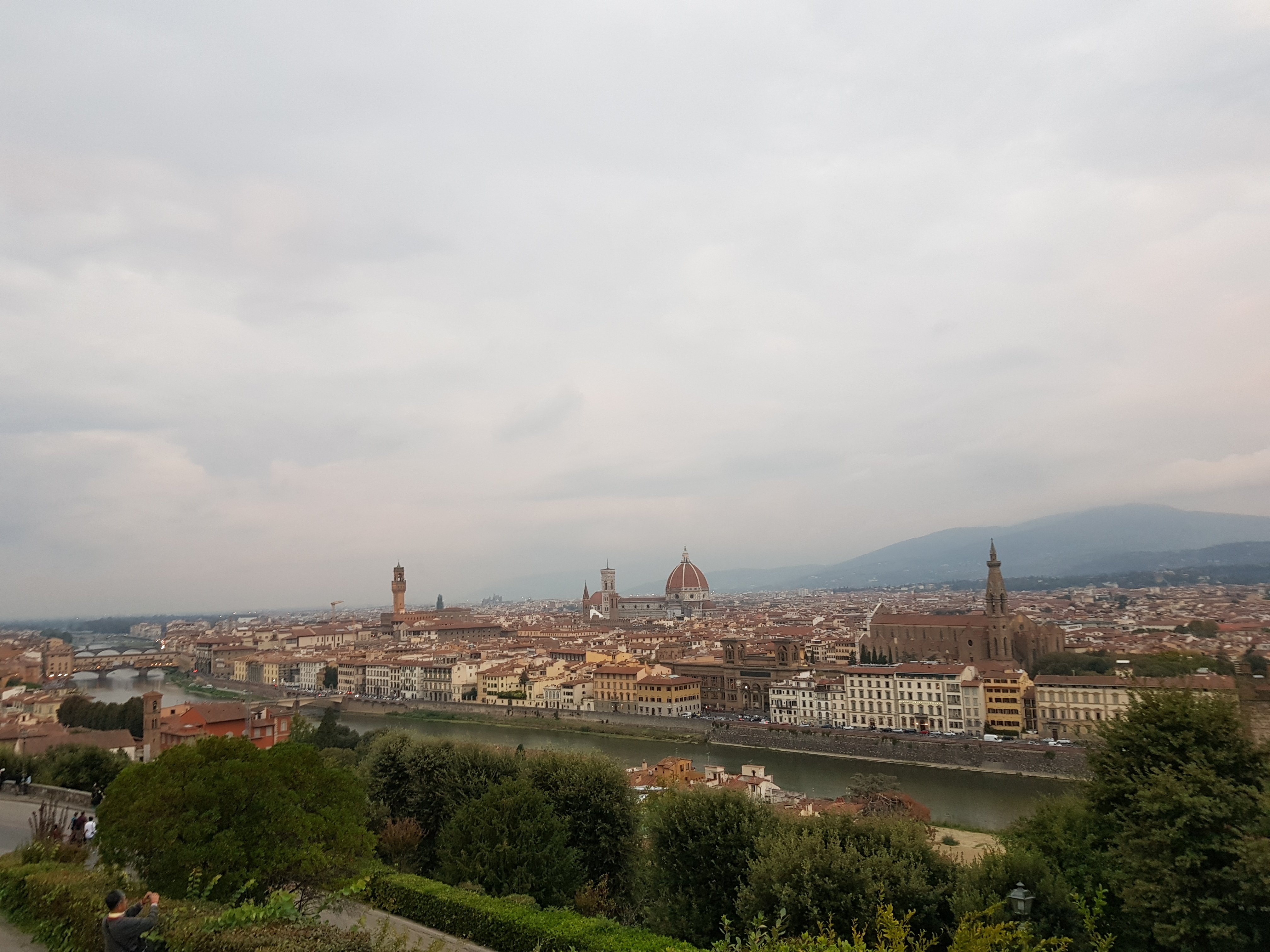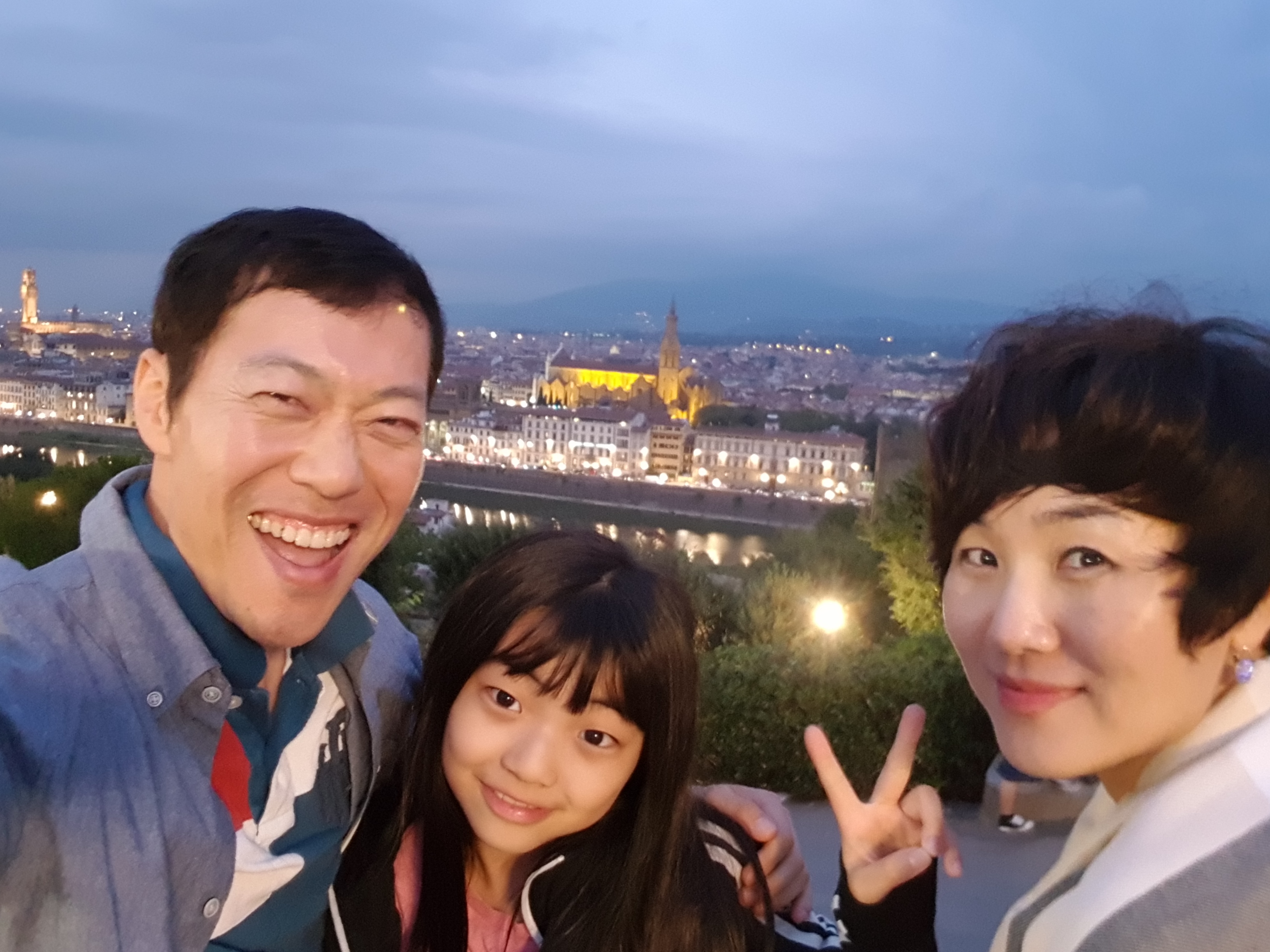 우리 가족은 피렌체 시내를 가로질러 언덕에 있는 미켈란젤로 광장으로 올랐습니다. 피렌체 시내가 보이는 낮은 성벽에 참새 떼처럼 사람들이 따닥따닥 붙어 앉아 있었는데요. 우리 가족도 자리가 나길 기다렸다가 한 코너에 자리를 잡았습니다. 피렌체 시내전경이 한 눈에 들어오는데요. 얼마나 아름다운지 말로 다 표현하지 못할 정도의 아름다움이 있는 전경이었습니다. 만일 제 인생을 멈출 수 있다면 바로 이곳 이 순간에 멈췄으면 좋겠다는 생각이 들 정도로 고요한 감동이 있었습니다.