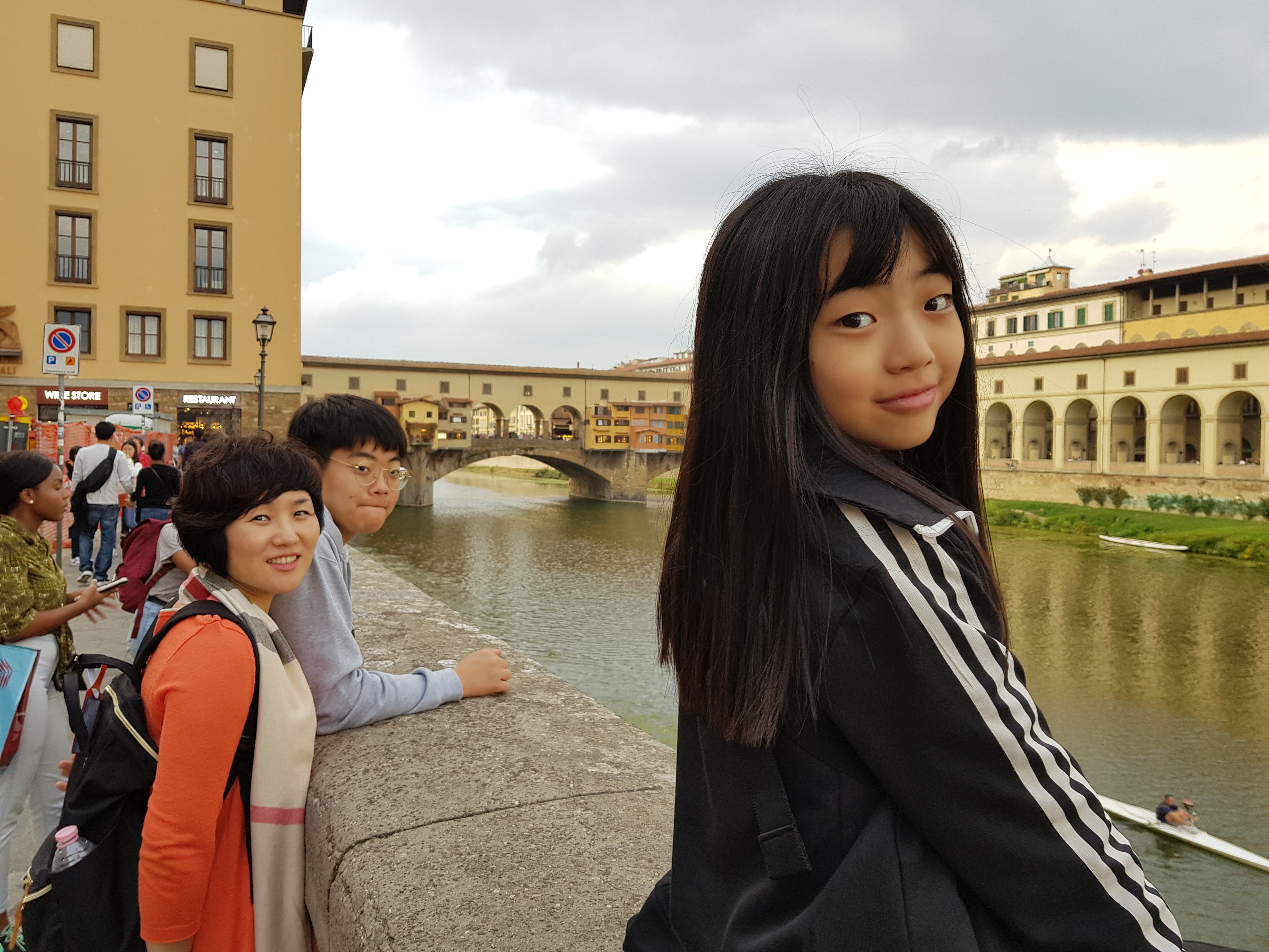 베키오 다리는 흐름해 보이기는 하지만 강변을 배경으로 사진을 찍어두면 이런 예술작품이 없다고 싶을 정도로 아름다운 인생사진을 건질 수도 있는 장소입니다. 한 폭의 유채화 같은 그림 같은 사진을 담을 수 있는데요. 제게는 우리 유진공주님 사진을 찍어보니 단테가 그리워했던 여인 베아트리체와 같은 미모라는 생각이 절로 들었습니다.