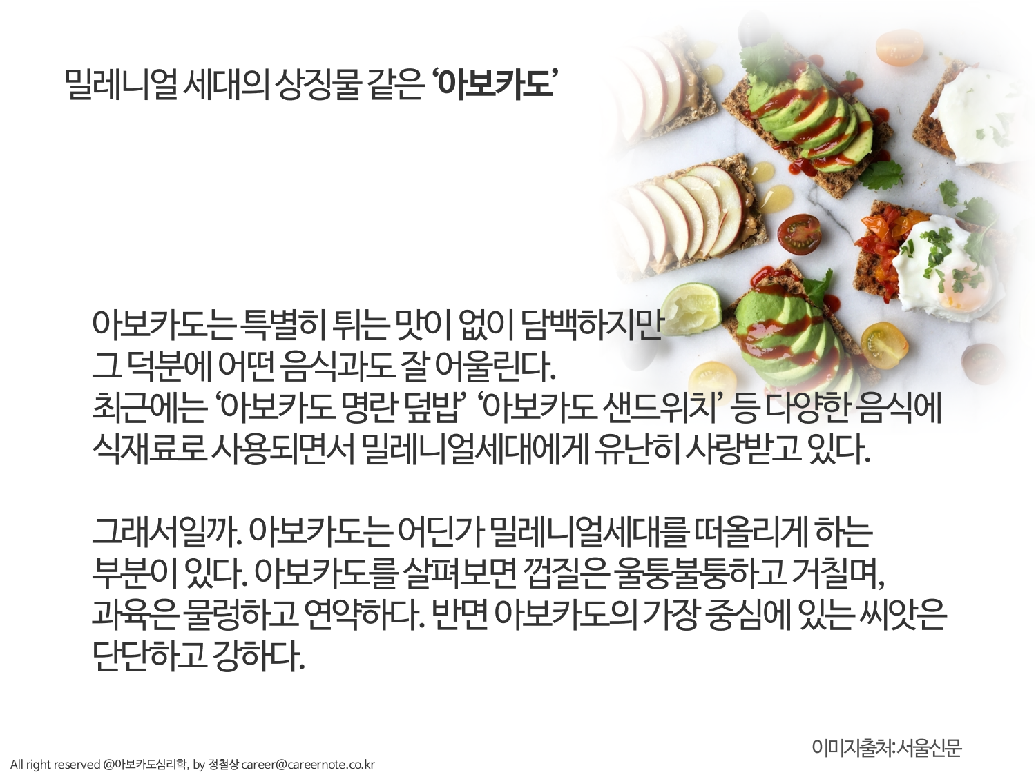그래서일까. 아보카도는 어딘가 밀레니얼세대를 떠올리게 하는 부분이 있다. 아보카도를 살펴보면 껍질은 울퉁불퉁하고 거칠며, 과육은 물렁하고 연약하다. 반면 아보카도의 가장 중심에 있는 씨앗은 단단하고 강하다. 밀레니얼세대도 이와 비슷하다. 겉으로 보기에는 까칠해서 다가가기 힘들고 무슨 생각을 하는지 잘 모르겠다. 한편으로는 너무 여리고 연약해서 쉽게 상처받는 것처럼 보인다. 그렇다면 그 중심은 어떨까. 그들의 마음도 아보카도 씨앗처럼 단단할까?