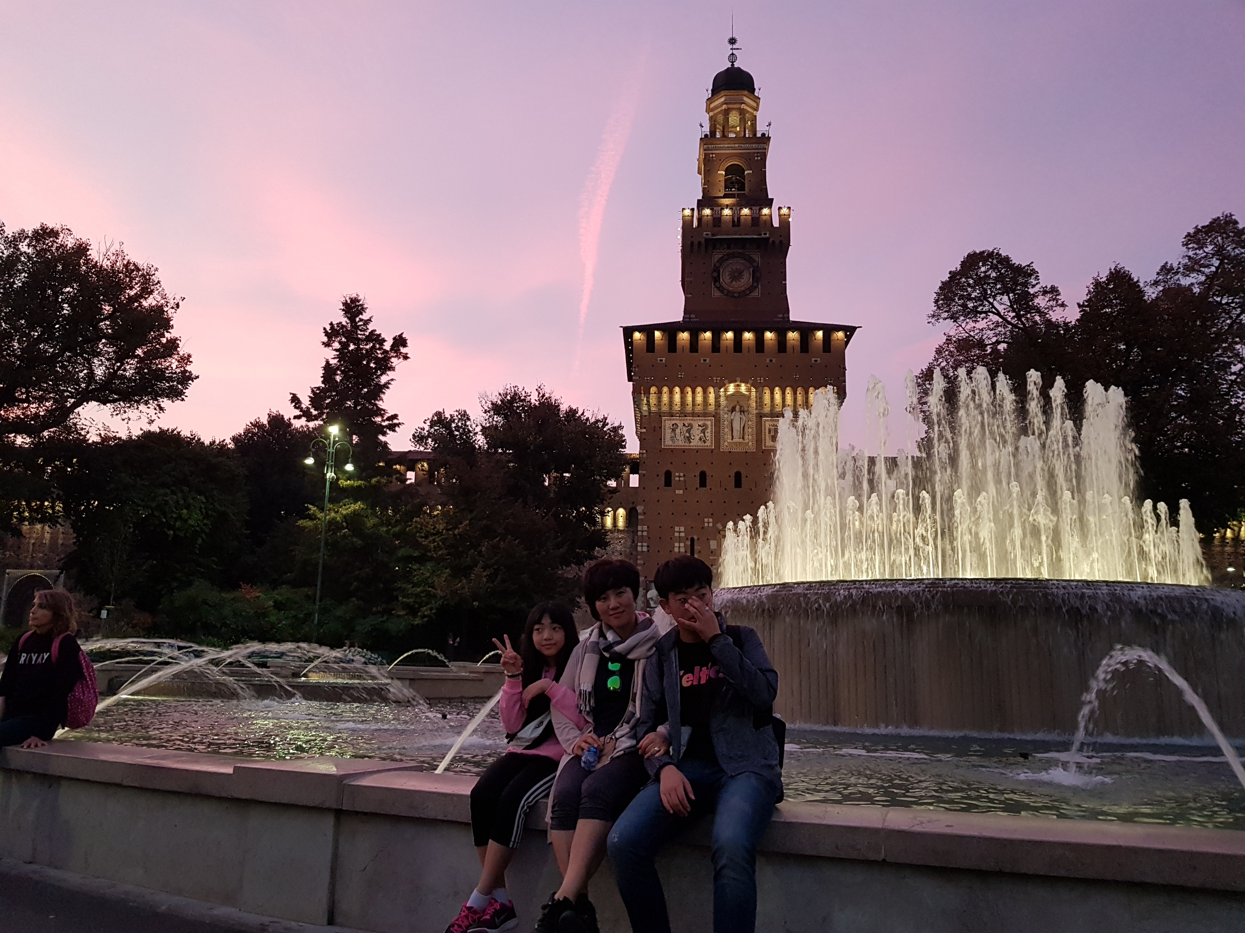 이렇게 밀라노 명소를 여기저기 다 둘러본 후 우리는 스포르체스코성으로 향했다. 길을 찾는데 몇 번의 오차가 있어 한 시간 이상 더 걸어서 다소 피곤함이 몰려 들었다. 그래도 목적지에 도착하니 그런 노곤함이 싹 다 사라질 정도로 아름다운 풍경이었다. 다만 너무 많은 잡상인들이 판매행위를 하며 다가오다 보니 다소 불쾌한 기분이 들었다. 순간적으로 끈 하나를 손목에 묶는 수법으로 돈을 받아갔다. 워낙 빨라서 4인 가족이 모두 피하기 어려울 정도다. 제일 힘이 약한 유진이가 걸려서 어쩔 수 없이 구입을 했다.