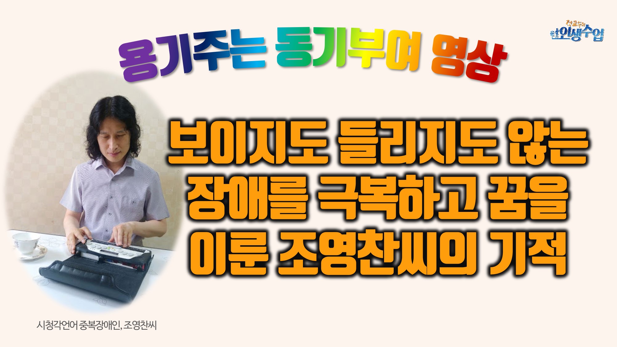 만일 삶의 의욕이 떨어지거나 동기부여를 받고 싶다면 시청각 중복장애를 딛고 꿈을 이룬 조영찬씨의 기적을 보세요. 삶의 자세와 태도가 바뀔 겁니다.