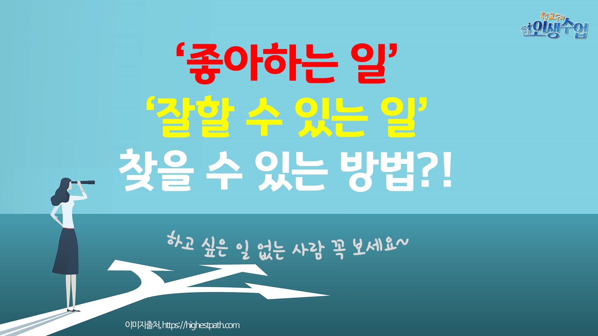‘좋아하는 일을 하는 것이 좋을까요?’ 아니면 ‘잘하는 일을 하는 것이 좋을까요?’ 많은 사람들이 던지는 대표적인 진로고민입니다. 여러분들은 어떻게 대답해주고 싶으세요. 꽤 많은 사람들이 하고 싶은 일 없이 해야만 하는 일을 하며 지내는 경우가 많지요. 그런데 그 일을 성스럽게 수행하는 사람이 있고, 억지로 마다못해 하는 사람들이 있습니다. 나중에 이 둘은 삶의 질이 엄청 차이가 나기 마련인데요.