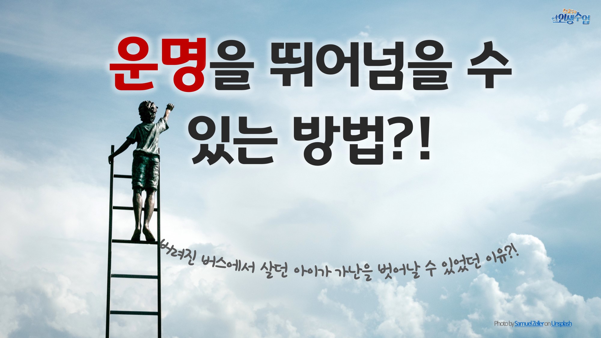 운명을 뛰어넘을 수 있는 방법이 있을까?! 어린 시절에 나는, ‘운명’이나 ‘기적’이라는 단어가 싫었다. 기적이 일어나지 않는 한 이 지긋지긋할 정도의 가난이 계속될 거라 믿었기 때문이었다. 인생에 기적 따위는 없다고 믿었다.