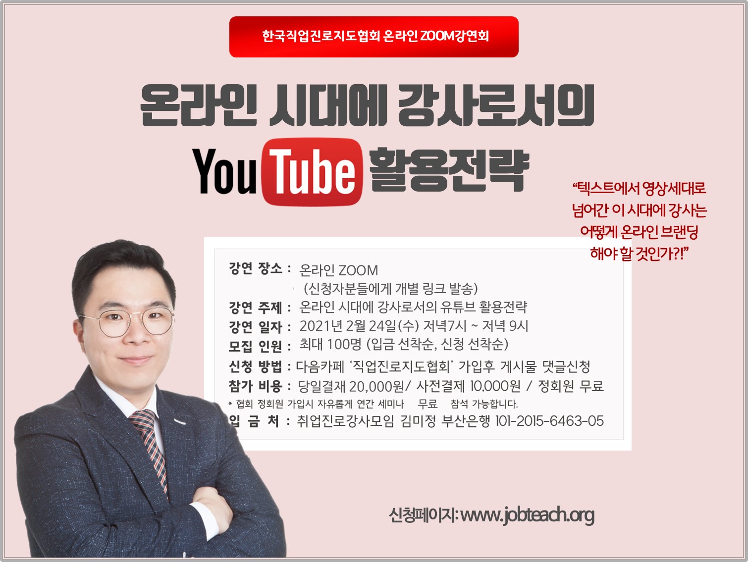 | ZOOM특강)온라인 시대에 강사로서의 유튜브 활용전략 (0) | 2021.02.08 |