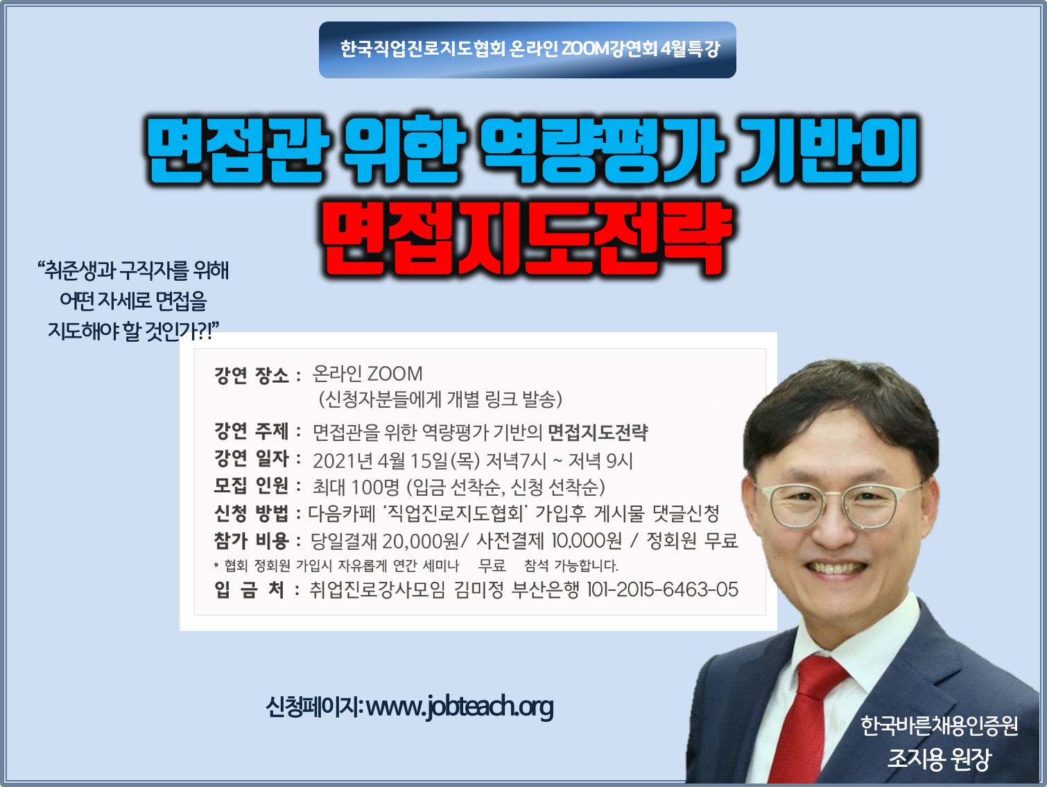#면접 #면접지도 #면접관교육 #조지용원장 #한국바른채용인증원 #면접지도전략 #역량평가 #면접전략 #면접질문 #특강 #강연 #교육 #직진협 #정기강연회 #온라인강연회 #한국직업진로지도협회 #강사모임 #취업강사 #진로강사 #자기계발강사 #대학교육 #진로교육 #취업교육 #취업상담 #진로상담 #직업상담 #취업진로지도 #취업진로지도전문가 #커리어코치정철상 #정철상교수
