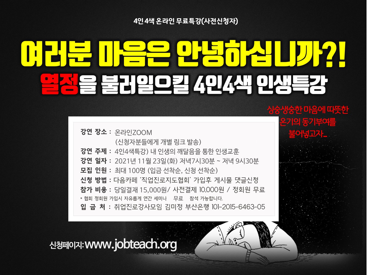 신청 방법 : https://cafe.daum.net/jobteach/VpUM/258 에 댓글로 신청해주시길 바랍니다. (순번, 성함, e메일)