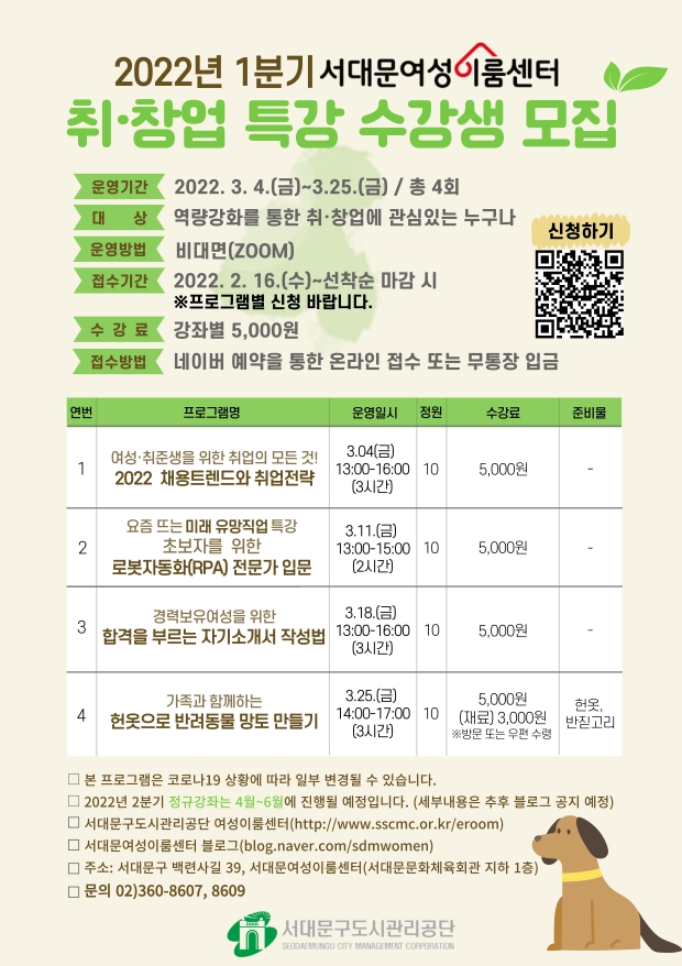 2022년 1분기 취·창업 특강 수강생을 모집하오니