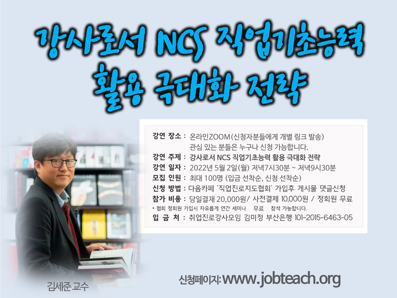 #김세준 #김세준교수 #김세준대표 #NCS #NCS특강 #NCS직업기초능력 #NCS강사 #강사로서의NCS #강의역량강화 #취업역량강화 #커리어 #진로지도 #취업지도 #특강 #강연 #교육 #직진협 #정기강연회 #온라인강연회 #한국직업진로지도협회 #강사모임 #취업강사 #진로강사 #대학교육 #진로교육 #취업교육 #취업진로지도 #취업진로지도전문가 #커리어코치정철상