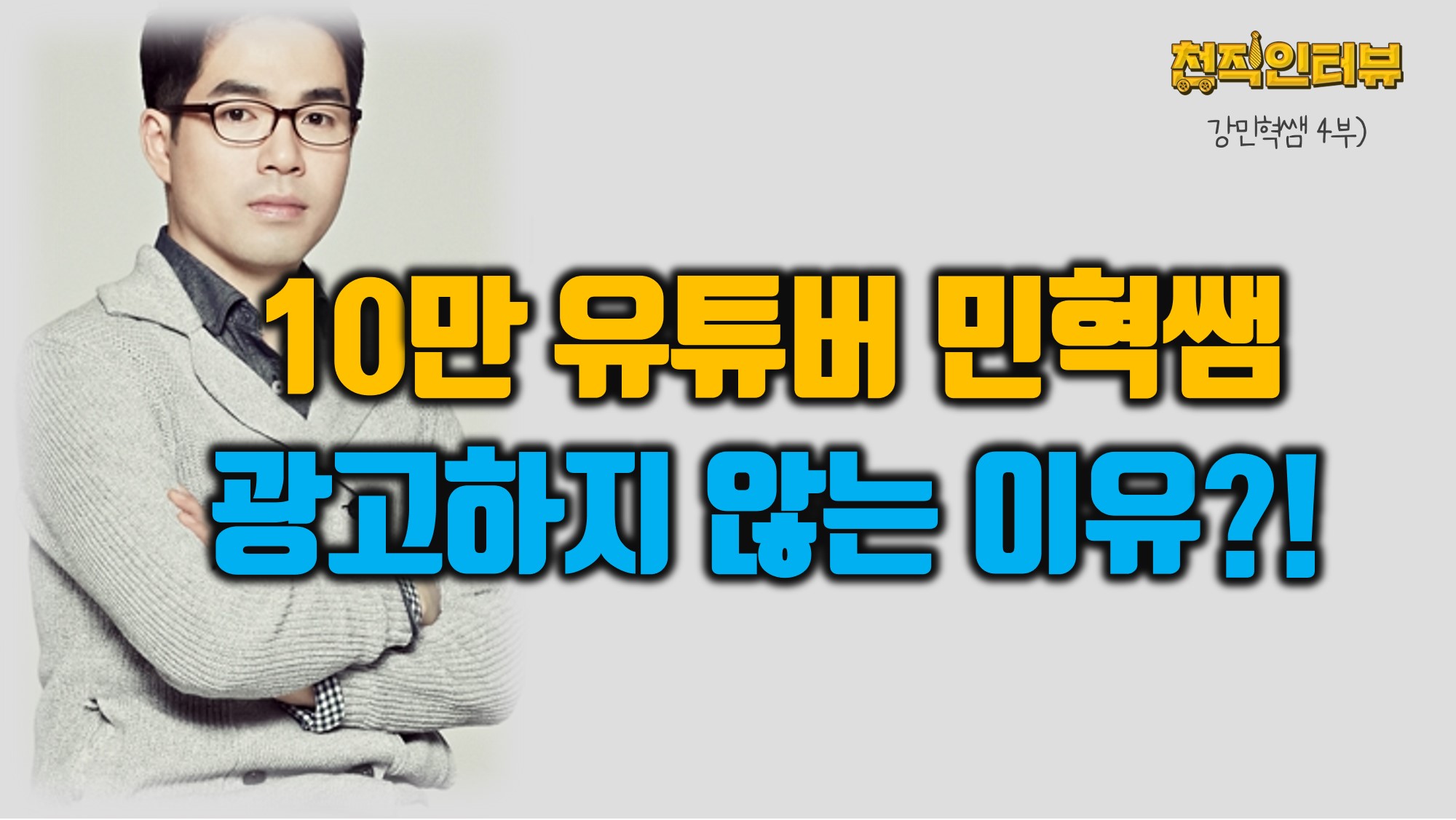 유튜브 구독자가 10만명 정도가 되면 광고수익만 대기업 연봉수준을 훌쩍 뛰어넘는다고 하는데요. 그럼에도 불구하고 강민혁 선생님은 일체 광고를 하지 않는다고 합니다. 심지어 구독자분들이 앞광고 넣어달라고 애원할 정도인데요. 왜 강민혁쌤은 유튜브에 광고를 넣지 않는 것일까요?!