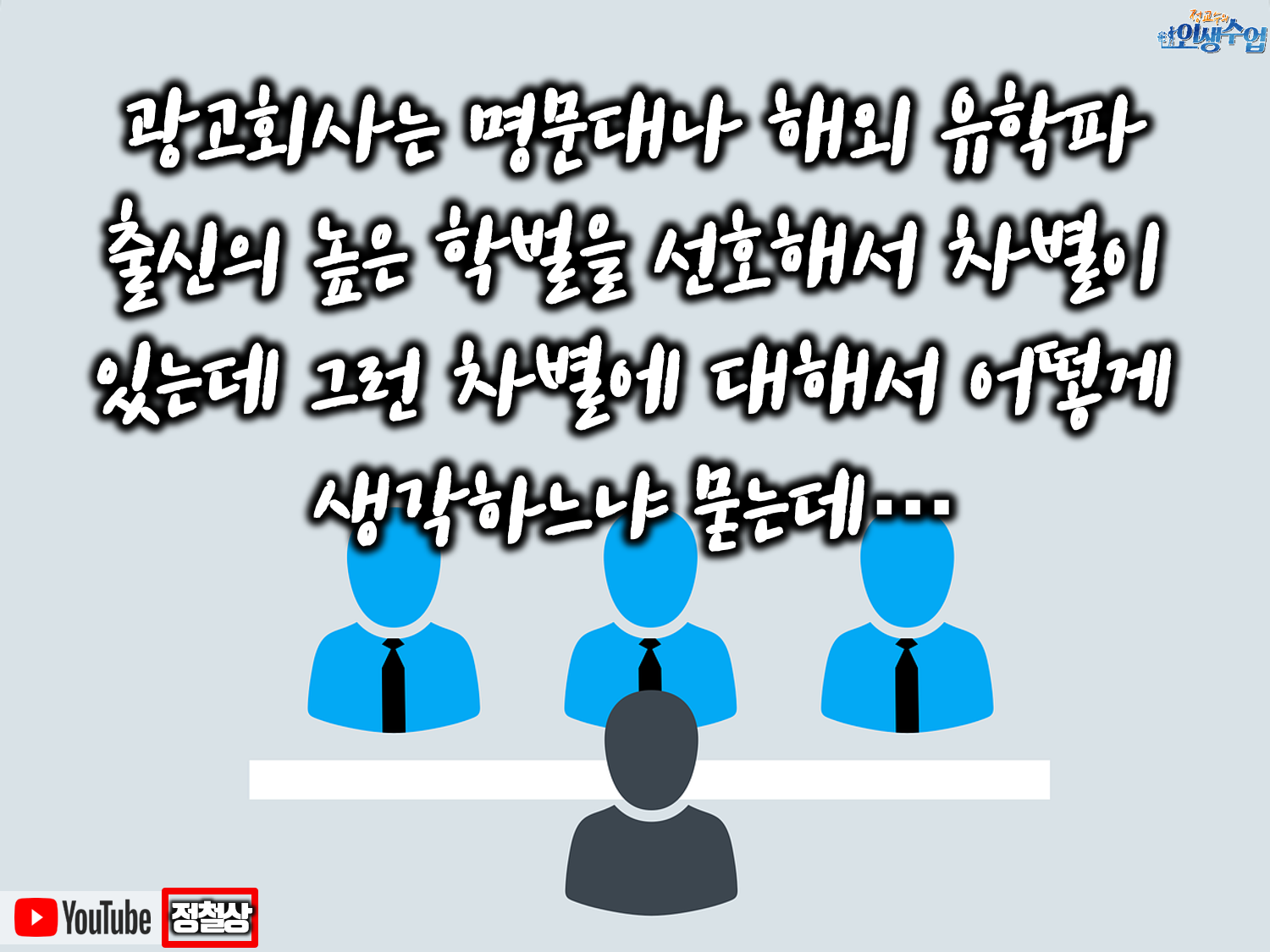 면접 질문 중에 당신이 지원자 중에 유일한 지방대생이었다. 광고회사는 명문대나 해외 유학파 출신의 높은 학벌을 선호해서 차별이 있는데 그런 차별에 대해서 어떻게 생각하느냐는 질문이었다.