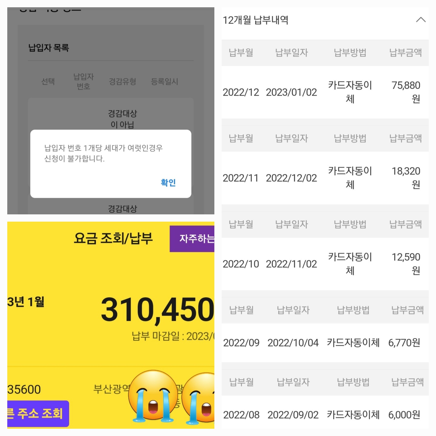 전달에 비해서는 4배가 더 올랐다. 그러면 우리집은 400%가 더 오른 것이다. 8월 최저요금과 대비하면 무려52배가 더 올랐다. 난방비 경감제도가 있기에 신청해보려 했더니 안 된다 떠오른다-_-;;