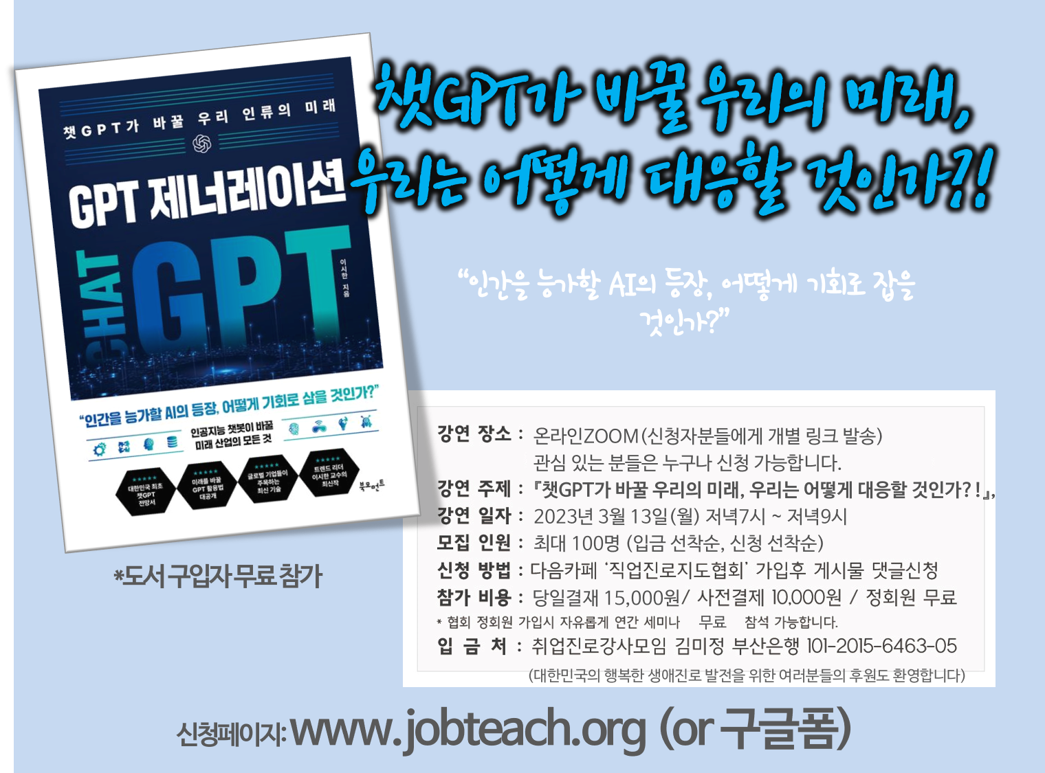 신간도서를 구매하신 분들에게는 무료입니다. 아래 링크에서 이시한 교수님의 신간 『GPT 제너레이션 : 챗GPT가 바꿀 우리 인류의 미래』 도서를 구매하신 분들은 모두 무료 참여가 가능합니다. 다만 교육 당일 화면으로 도서 인증을 해주셔야만 하며 그렇지 않은 경우 무료참여가 어려움을 너그럽게 양해 부탁드립니다.