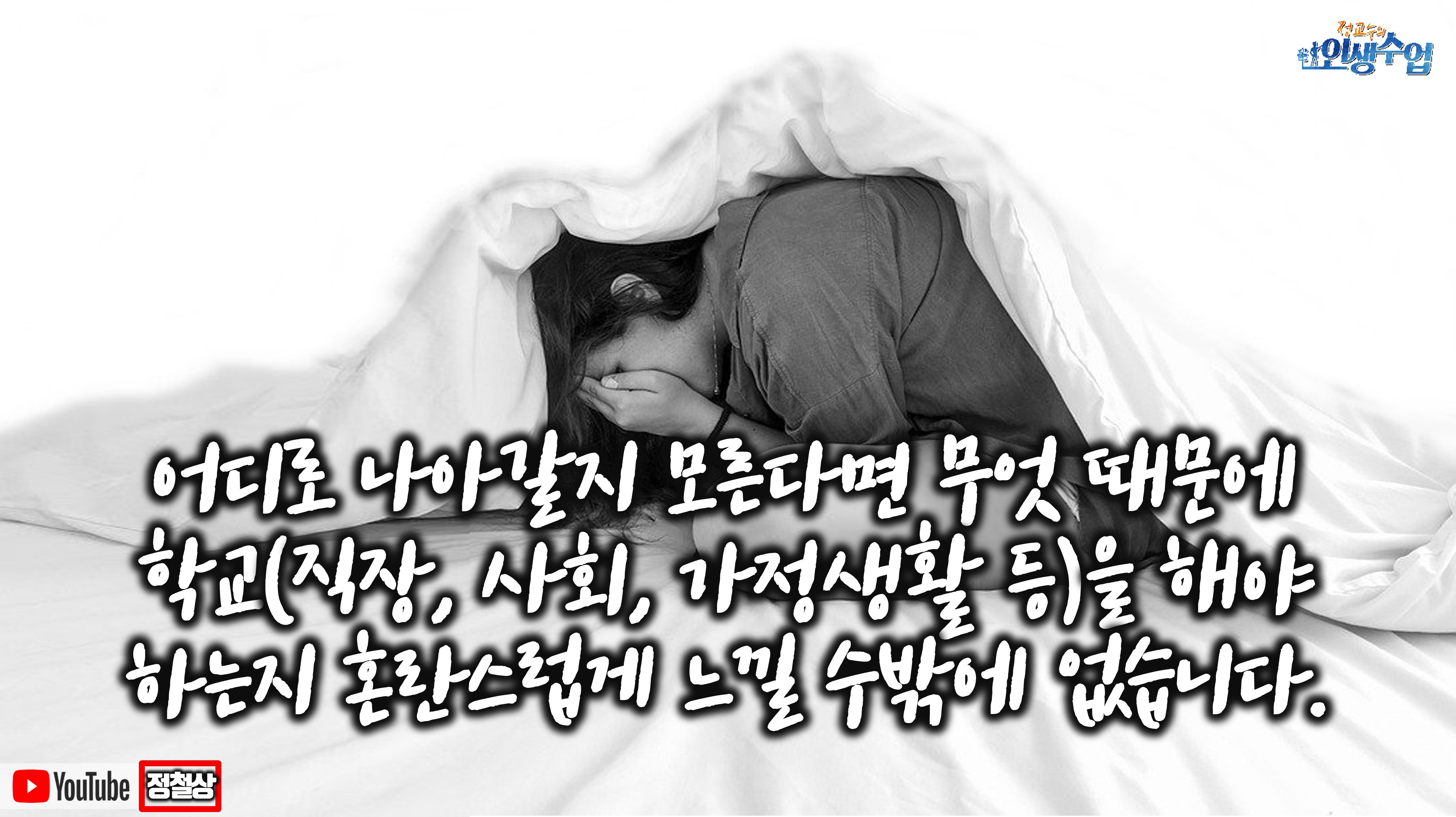 앞으로 어디로 나아갈지 모른다면 무엇 때문에 학교생활(혹은 직장, 사회, 가정생활 등)을 해야 하는지 혼란스럽게 느낄 수밖에 없습니다. 그런 면에서 어떤 목적으로 삶을 살아갈지를 정하는 것이 무엇보다 중요합니다. 물론 그 목적지에 이르는 수단은 사람마다, 나이마다, 상황마다, 의식수준마다 각기 서로 다 다를 수 있습니다.