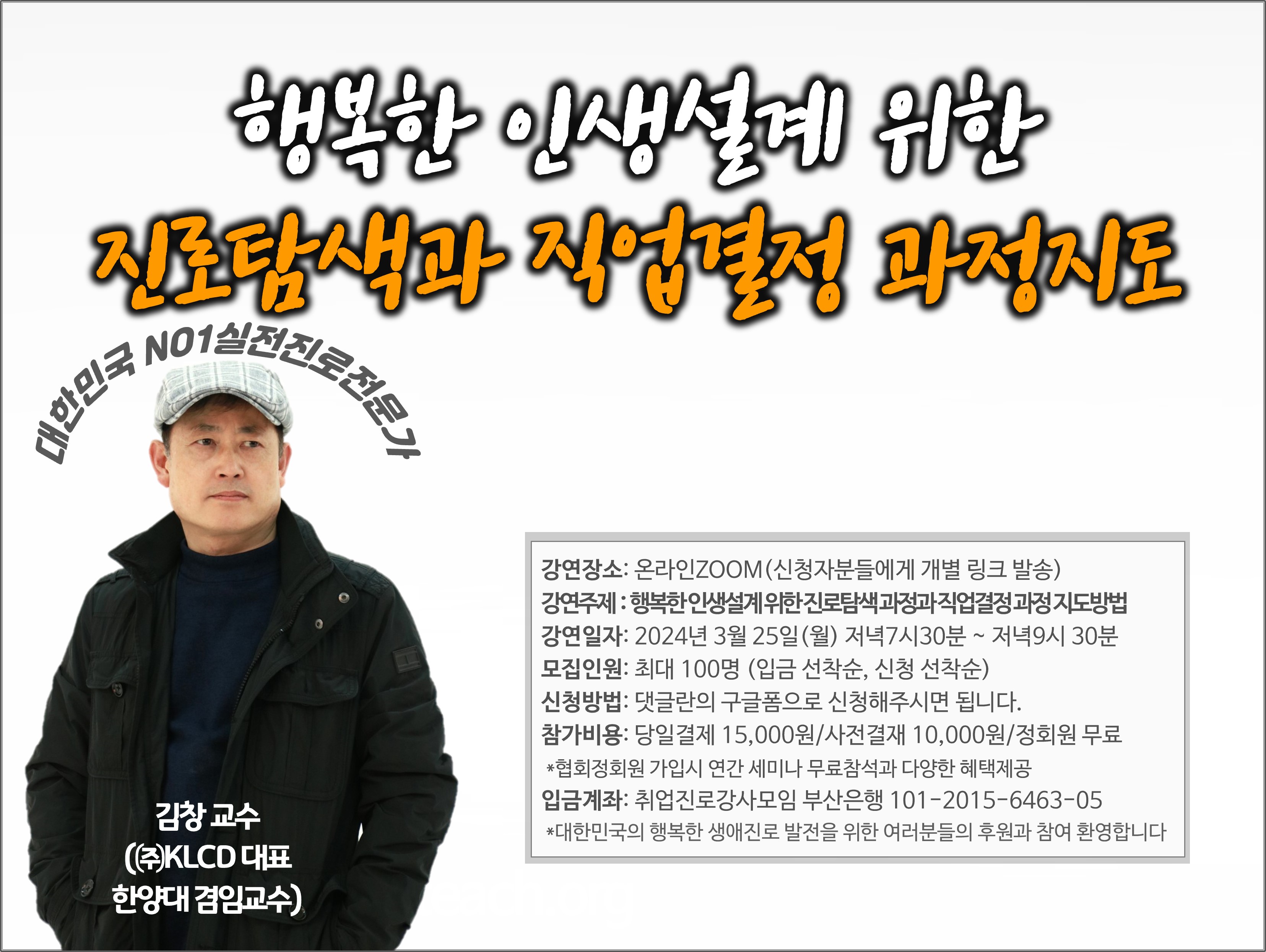 일정 : 2024년 3월 25일(월) 오후 7시 30분 ~ 9시 30분 장소 : 온라인(ZOOM)으로 진행 (신청자분들에게 주소 개별통보) 교육비: 10,000원(취업진로강사모임 김미정 부산은행 101-2015-6463-05) 담당자: 정철상