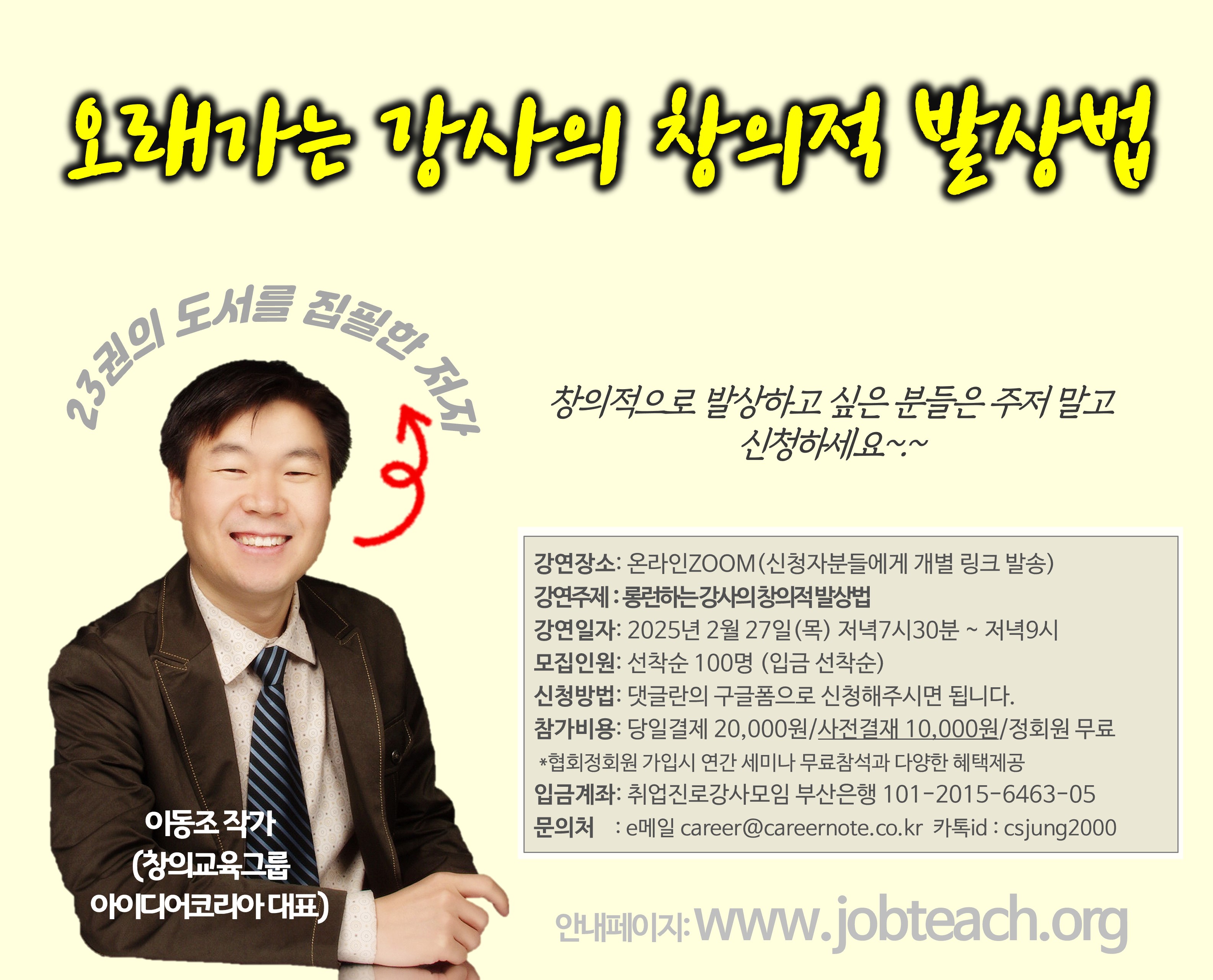 #이동조 #이동조작가 #창의성 #창의력 #창의인재 #창의방정식 #창의적인재 #강사특강 #교사특강 #자기계발 #자기관리 #글쓰기 #책쓰기 #말하기 #강의록준비 #말하는법 #진로탐색 #생애설계 #직진협 #한국직업진로지도협회 #커리어코치 #정철상