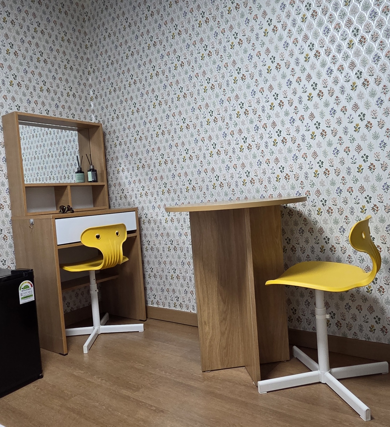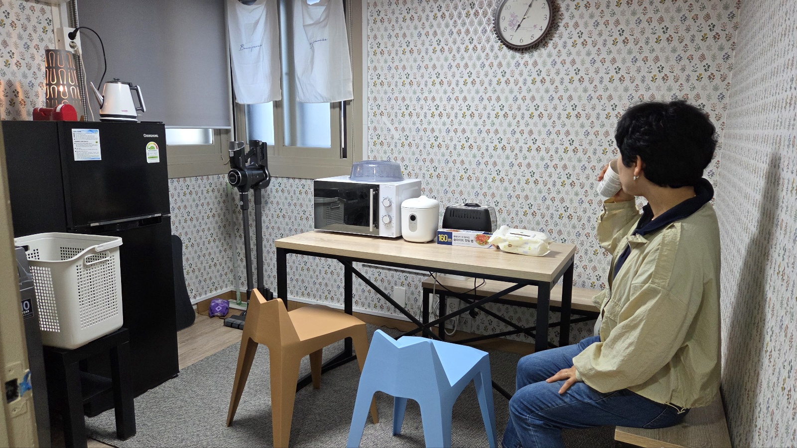 전자레인지, 인덕션, 냉장고, 생수기, 커피, 간식까지 모두 제공되니 말 그대로 ‘살아보는 숙소’ 느낌.