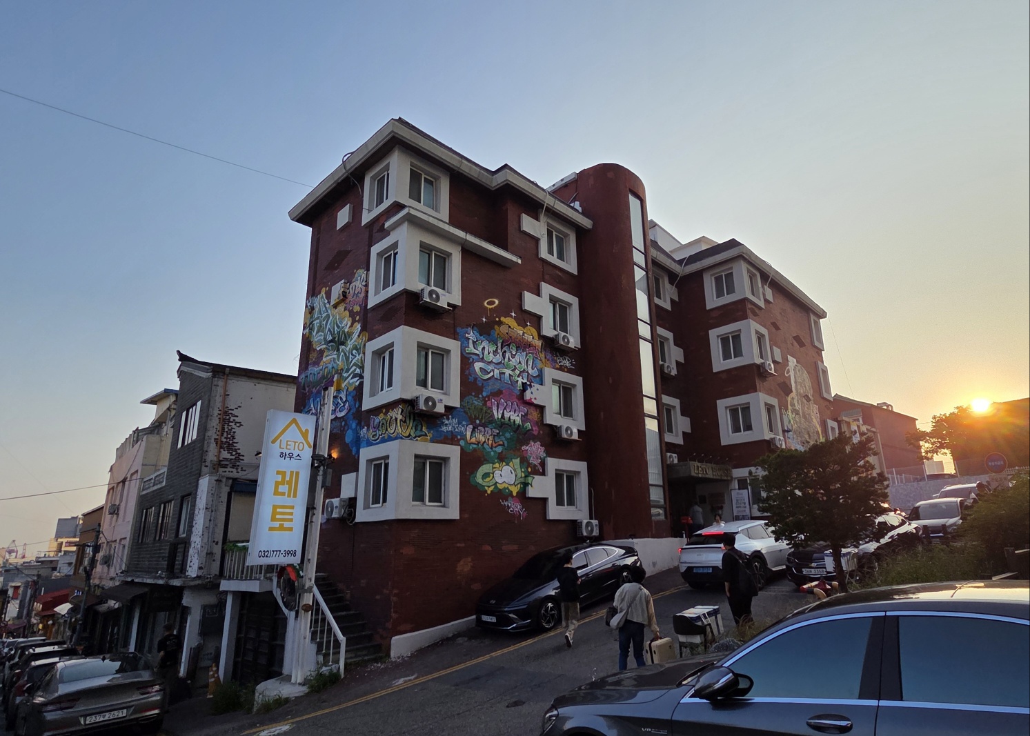 📸 외관의 거대한 벽화 모습이 들어오죠. 이런 숙소, 국내에 많지 않아요!
