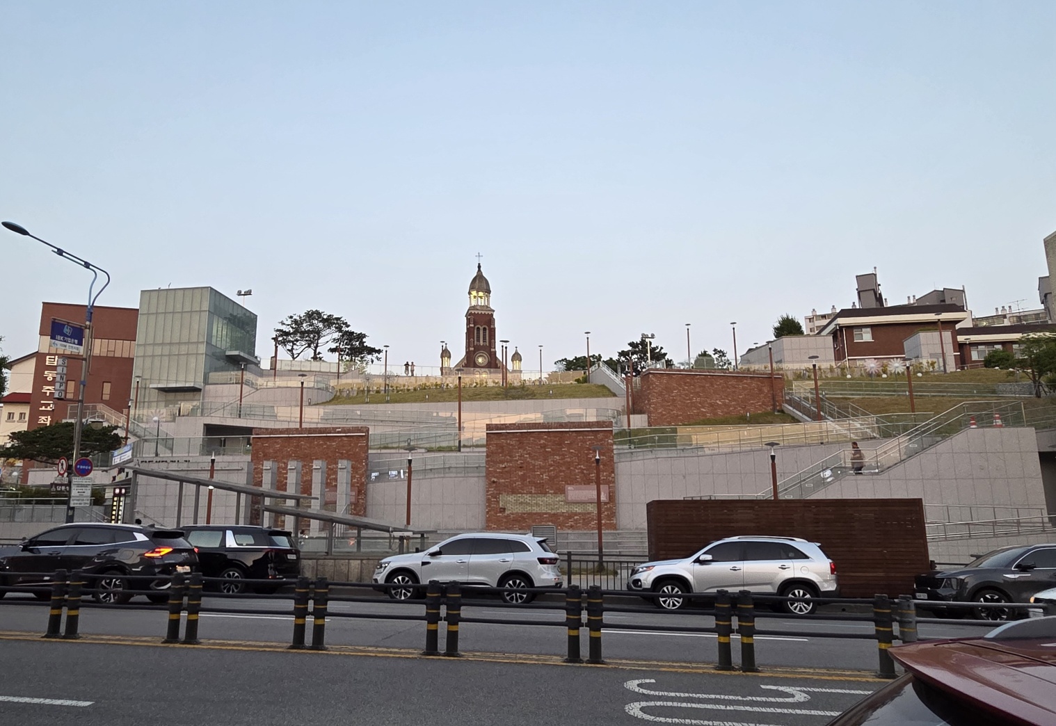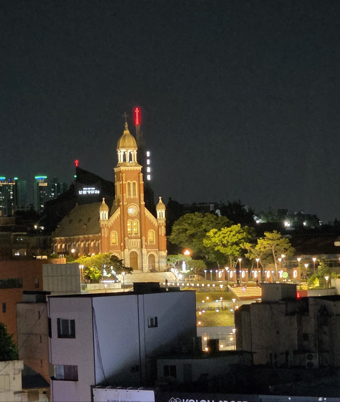 늦은 야식을 배불리 먹은 탓에 밤늦게 답동성당까지 산책도 다녀왔답니다. 야경 속 붉은 벽돌 성당 앞에서 찍은 가족사진은 이 여행의 또 다른 명장면이 되었죠.