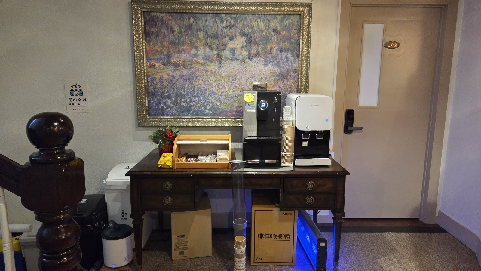 전자레인지, 인덕션, 냉장고, 생수기, 커피, 간식까지 모두 제공되니 말 그대로 ‘살아보는 숙소’ 느낌.