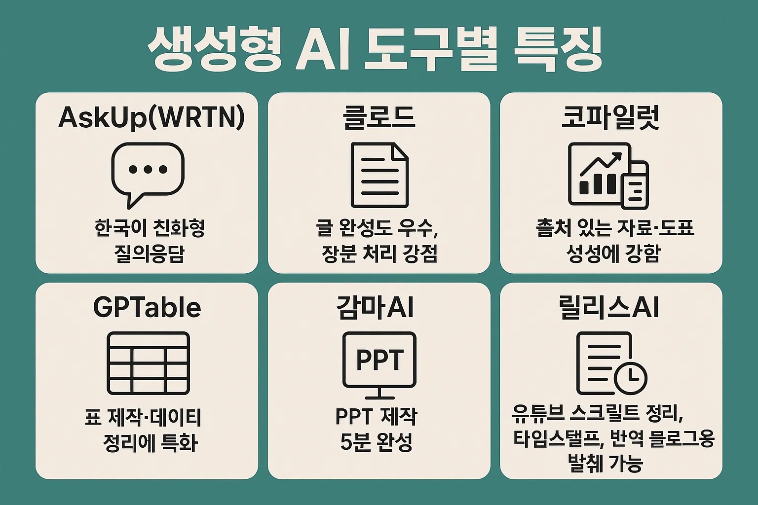 생성형 AI는 챗GPT만이 아닙니다. AskUp, 클로드, 코파일럿, GPTable, 감마AI, 릴리스AI 등 다양한 AI 도구의 특성과 활용법을 실제 사례와 함께 알려드립니다.