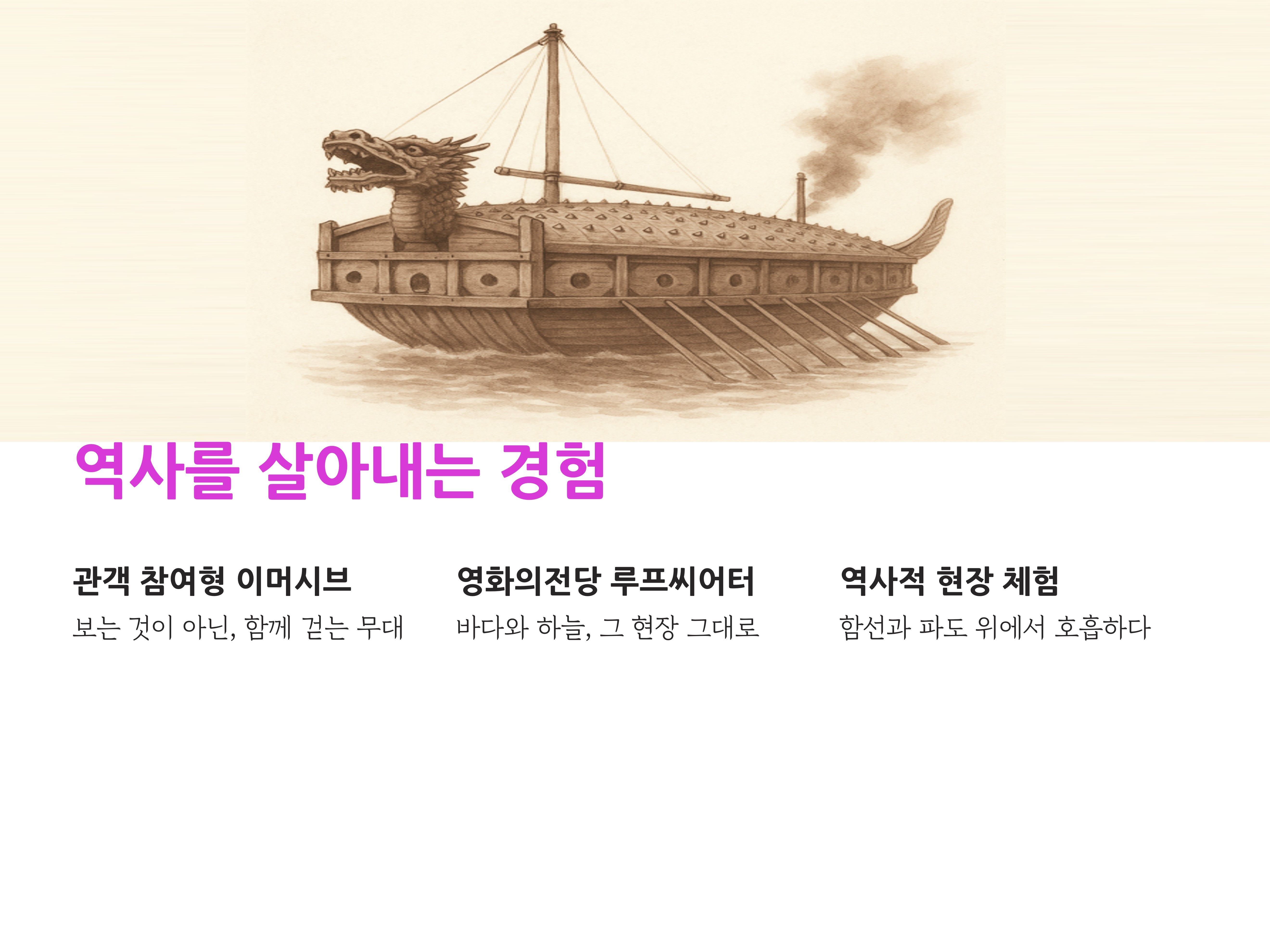 이번 공연은 단지 ‘보기만 하는’ 공연이 아닙니다. 관객이 직접 참여하는 이머시브 형태로, 부산포대첩의 역사적 현장을 살아내는 경험으로 초대합니다. 스스로 그 물살 위를 걸어보고, 총성과 파도의 울림 속에 서보세요.