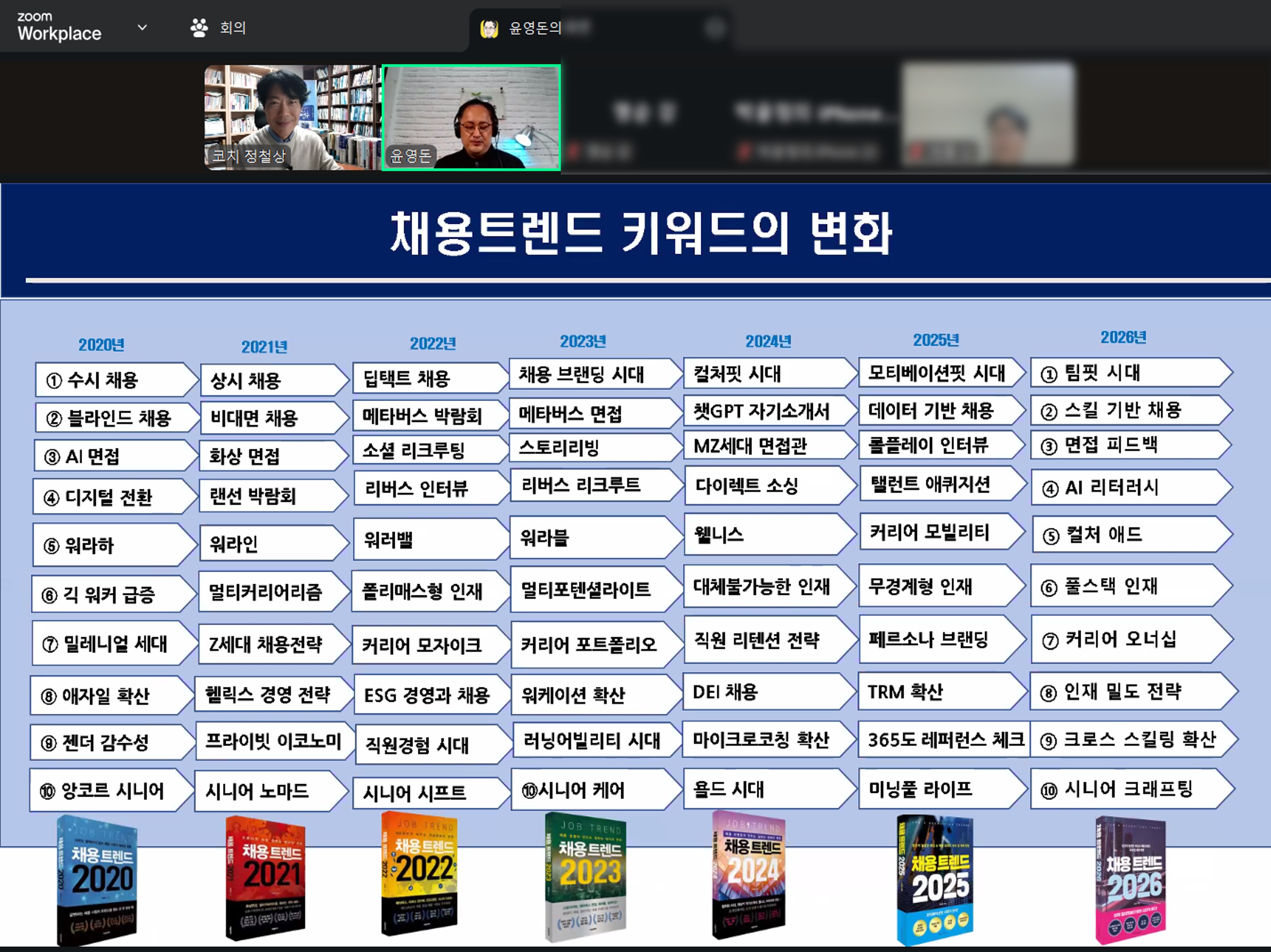 윤코치님이 ‘채용트렌드’라는 한 주제를 7년째 꾸준히 이어오며 시리즈를 완성해오신 과정이 딱 그 말과 같았습니다. 빠르게 변화하는 시대 속에서도 한 흐름을 지속적으로 추적하고 정리해온 노력, 그 자체가 ‘지속의 힘’을 보여준 것 같아요.