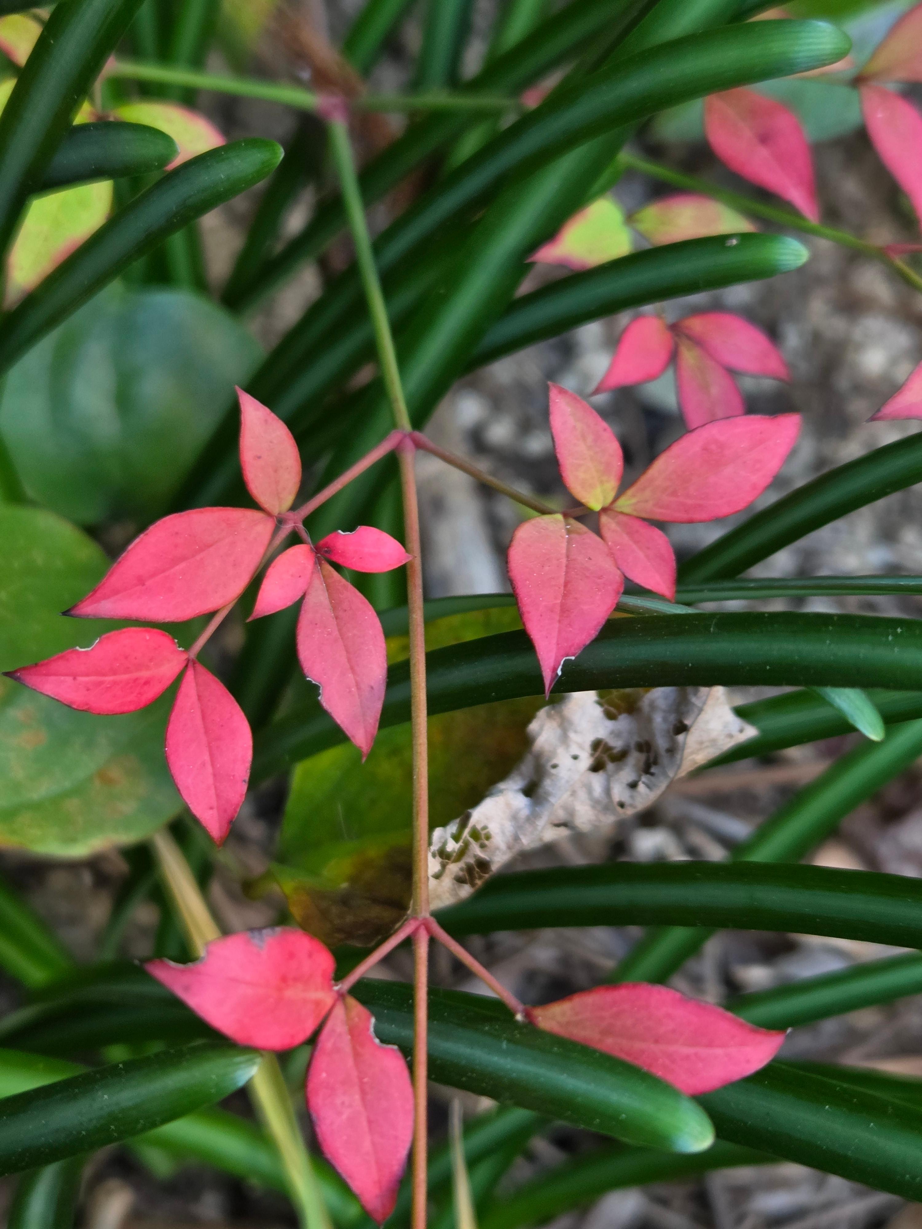 - 진분홍빛 남천잎과 짙은 초록 사이의 시선 유혹