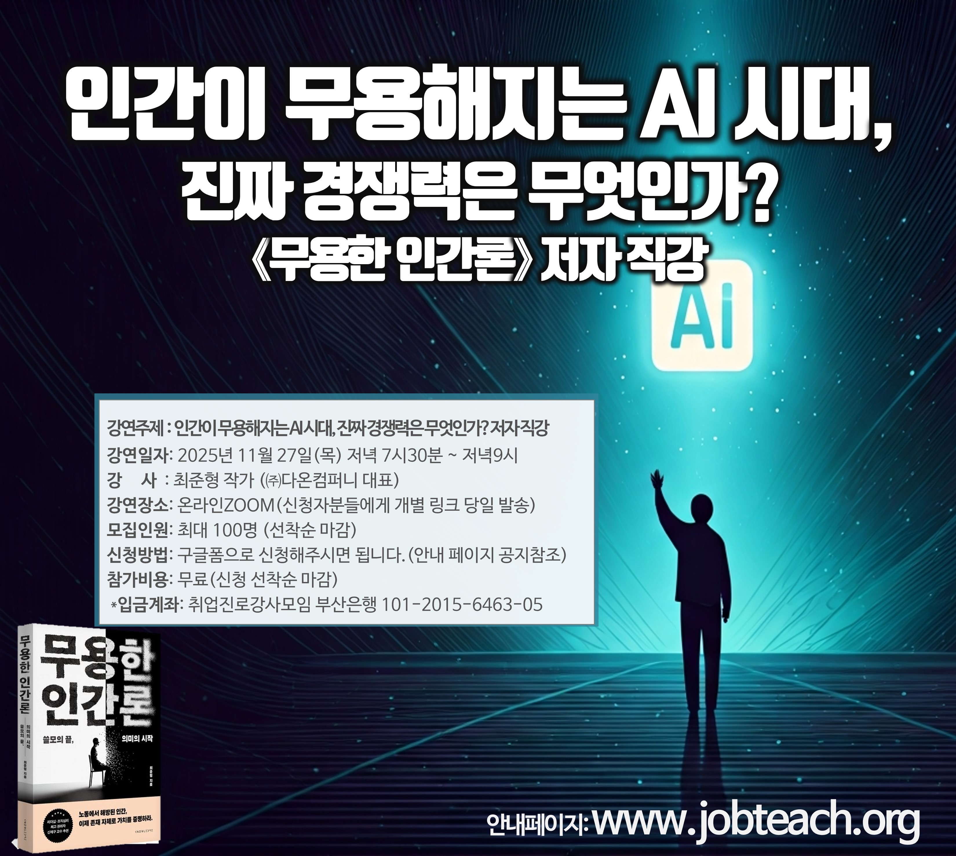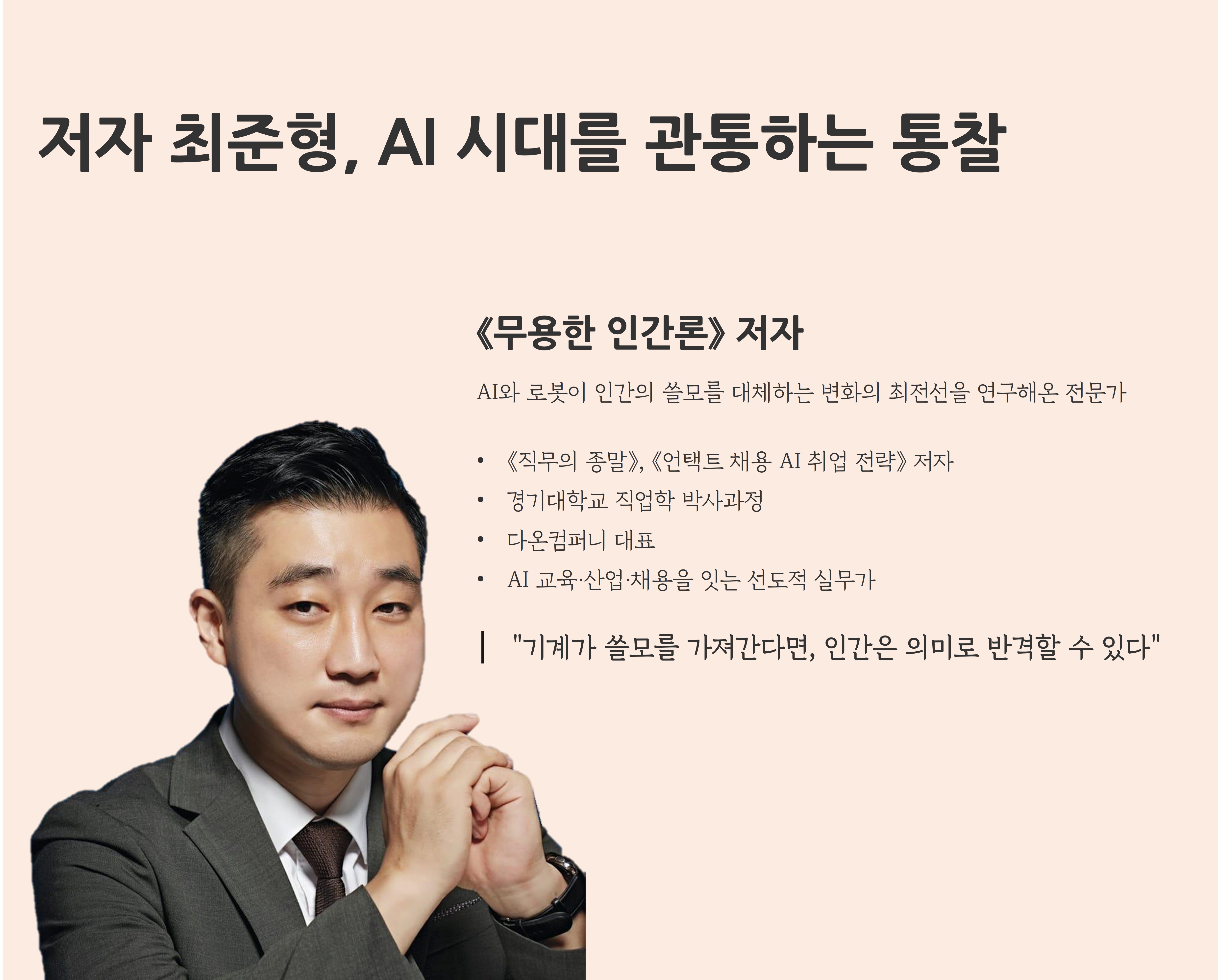 #무용한인간론 #무용한인간 #생성형AI #AI채용 #AI시대 #AI시대커리어전략 #AI생존법 #신간도서 #추천도서 #저자특강 #직업의변화 #최준형 #최준형대표 #최준형강사 #취준형작가 #취준형TV #직무특강 #취업특강 #온라인강연회 #특강 #강연 #교육 #직진협 #한국직업진로지도협회 #커리어코치 #정철상