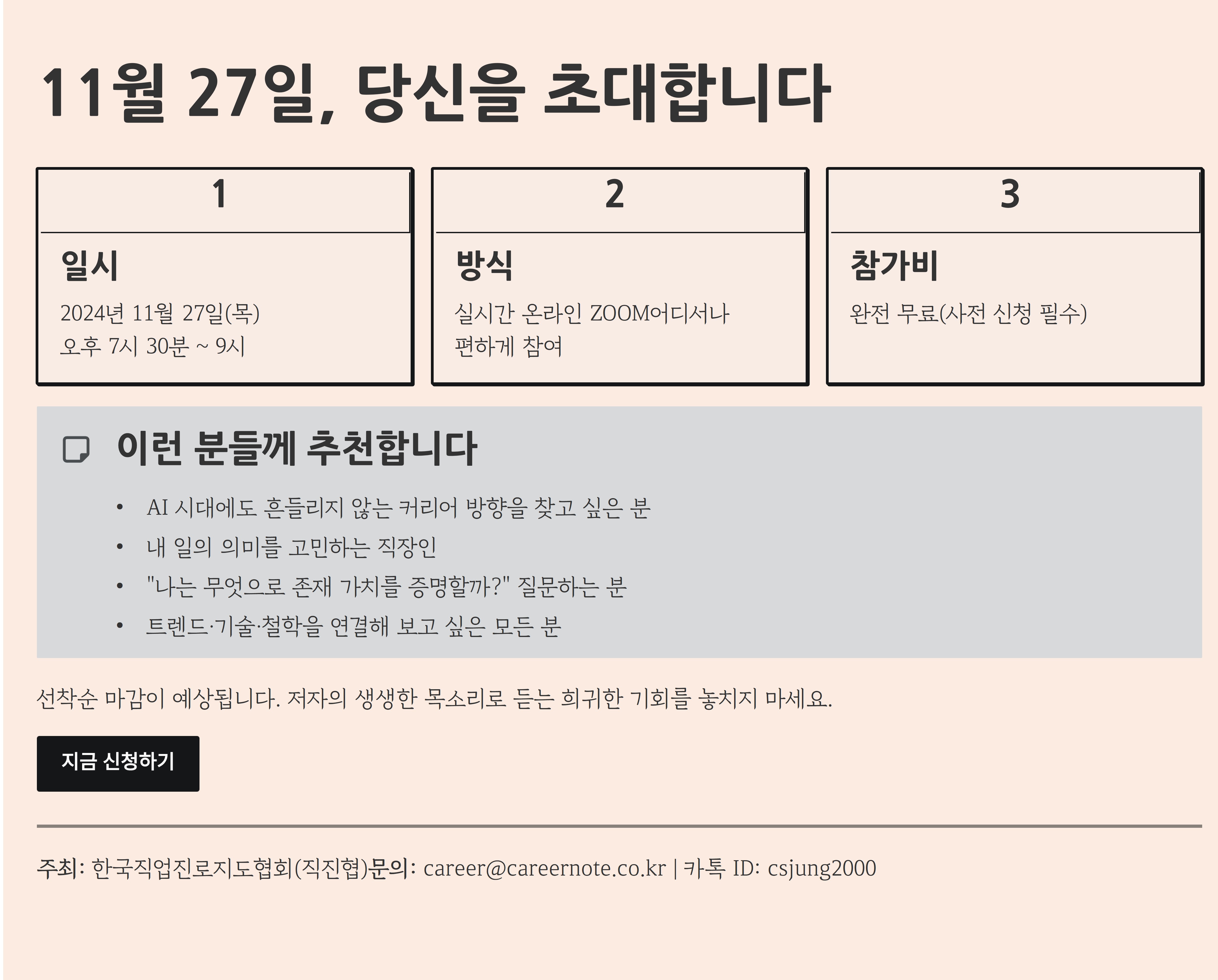 이번 특강에서는 이 철학적 메시지가 현실의 직업 변화, 커리어 전략, 삶의 의미 찾기와 어떻게 연결되는지 생생하게 알려드립니다.