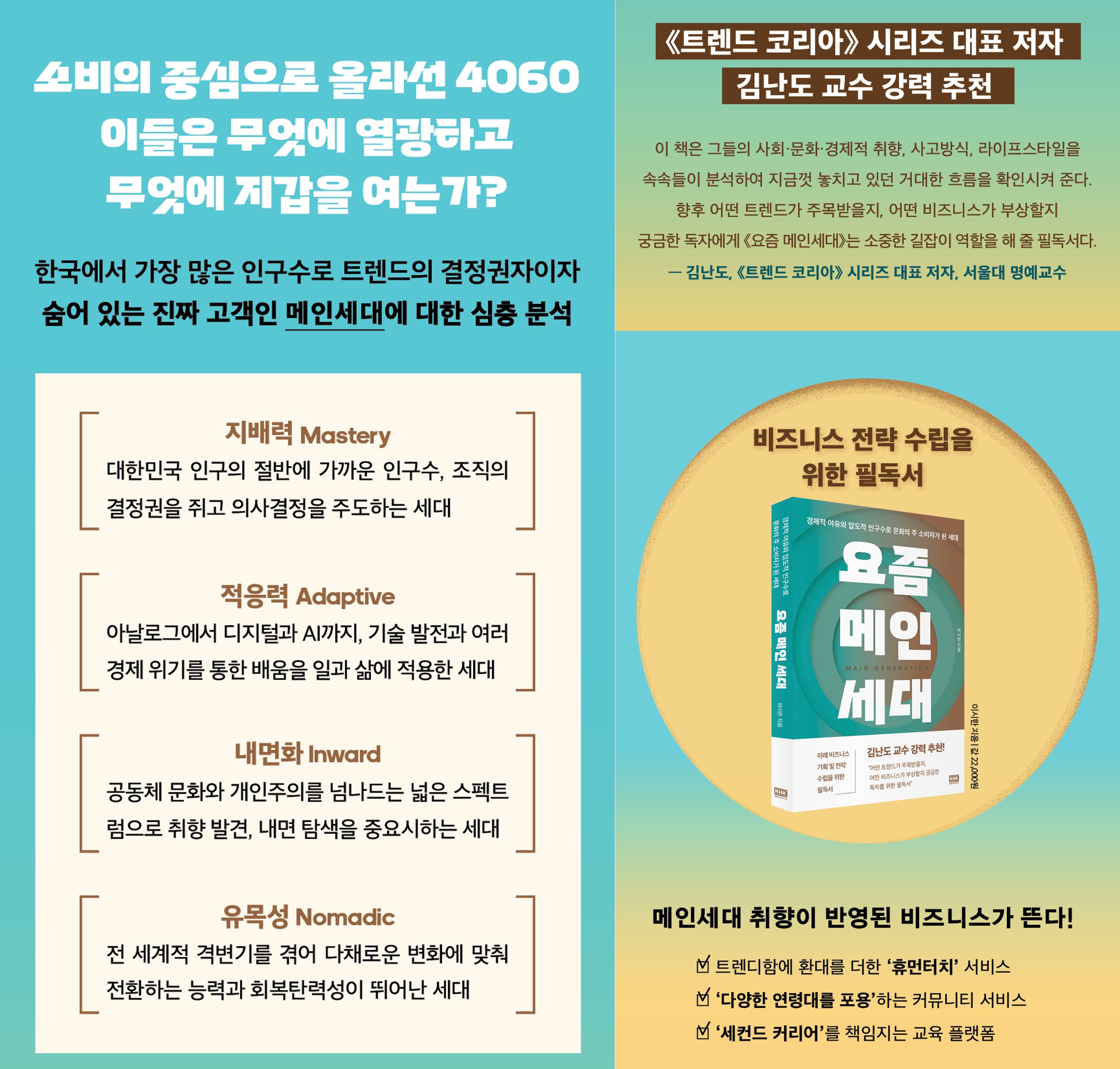 미래 비즈니스 기획 및 전략 수립을 위한 필독서『트렌드 코리아』 시리즈 대표 저자 김난도 교수 강력 추천『요즘 메인세대』는 대한민국 40~60대에 ‘메인세대’라는 새로운 네이밍을 부여하