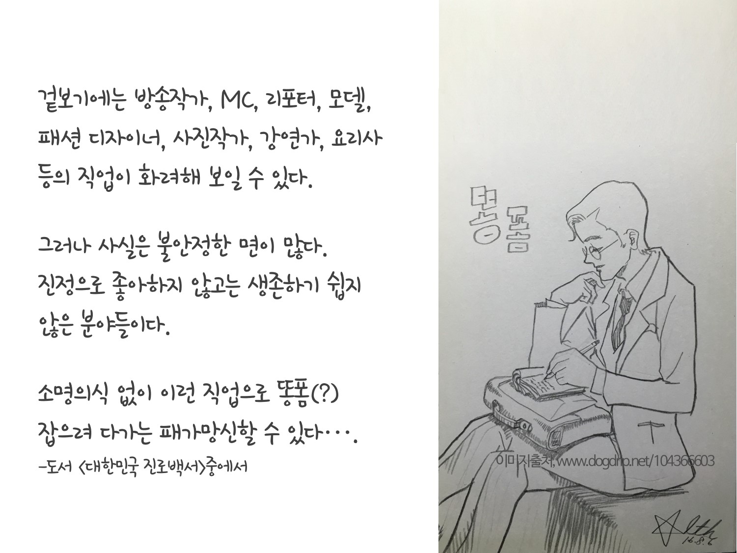 실제로도 그런 회사를 많이 만들어나가는 것이 건강한 직장문화를 구축하기 위한 중요한 사회적 과제다. 비단 직장만 그렇겠는가. 상당수의 직업도 그렇다. 겉보기에는 방송작가, MC, 리포터, 모델, 패션 디자이너, 사진작가, 강연가, 요리사 등의 직업이 화려해 보일 수 있다. 그러나 사실은 불안정한 면이 많다. 진정으로 좋아하지 않고는 생존하기 쉽지 않은 분야들이다. 소명의식 없이 이런 직업으로 똥폼(?) 잡으려다가는 패가망신할 수 있다.