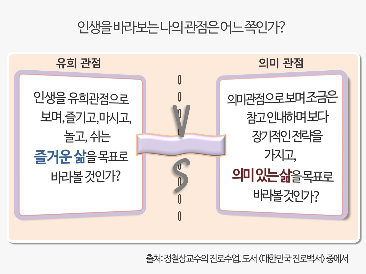 대학생에게 있어 대학생활도 중요하지만 조금 더 의식 있는 사랑들이라면 조금 더 큰 관점으로 인생을 바라봐야 할 필요가 있다. 그런 측면에서 앞서 살펴본 대학생활의 두 관점을 삶에 대입해보면 소비관점은 유희관점으로, 투자관점은 의미관점으로 치환할 수 있겠다.