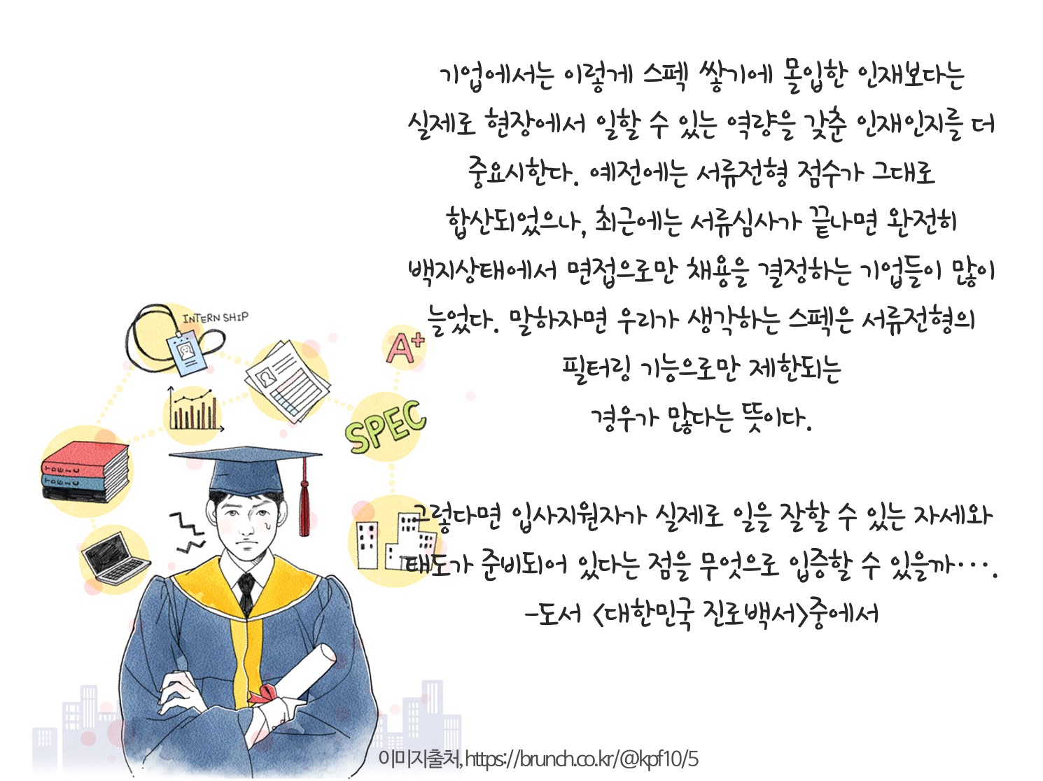 그러나 기업에서는 이렇게 스펙 쌓기에 몰입한 인재보다는 실제로 현장에서 일할 수 있는 역량을 갖춘 인재인지를 더 중요시한다. 예전에는 서류전형 점수가 그대로 합산되었으나, 최근에는 서류심사가 끝나면 완전히 백지상태에서 면접으로만 채용을 결정하는 기업들이 많이 늘었다. 말하자면 우리가 생각하는 스펙은 서류전형의 필터링 기능으로만 제한되는 경우가 많다는 뜻이다.