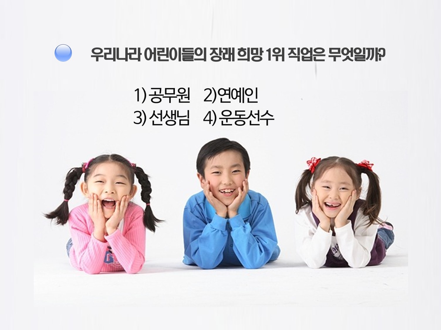 다소 시간이 많이 흘렀지만 2012년 3월 9일에 방송된 SBS <세대공감1억 퀴즈쇼> 에서 당시 초등학생들의 장래희망 1순위가 공개됐다. 나는 당연히 연예인일 거로 생각했다. 그런데 놀랍게도 1위는 공무원이었다. 이건 거의 해외토픽감이지 않을까 싶다. 어린아이들의 꿈이 공무원이라니 놀랍지 않은가.