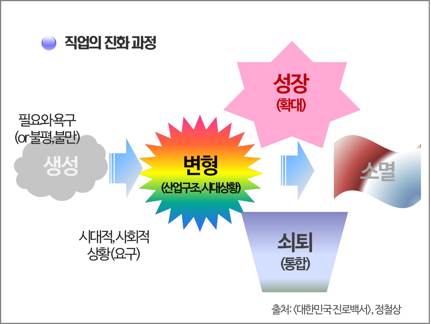 이렇게 시대적으로나 사회적으로 사람들의 요구에 따라 직업은 새롭게 생성된다. 이렇게 생성된 직업이 그대로 명맥을 이어가는 경우도 있지만 산업구조나 소비자의 요구에 따라 변형이 된다.