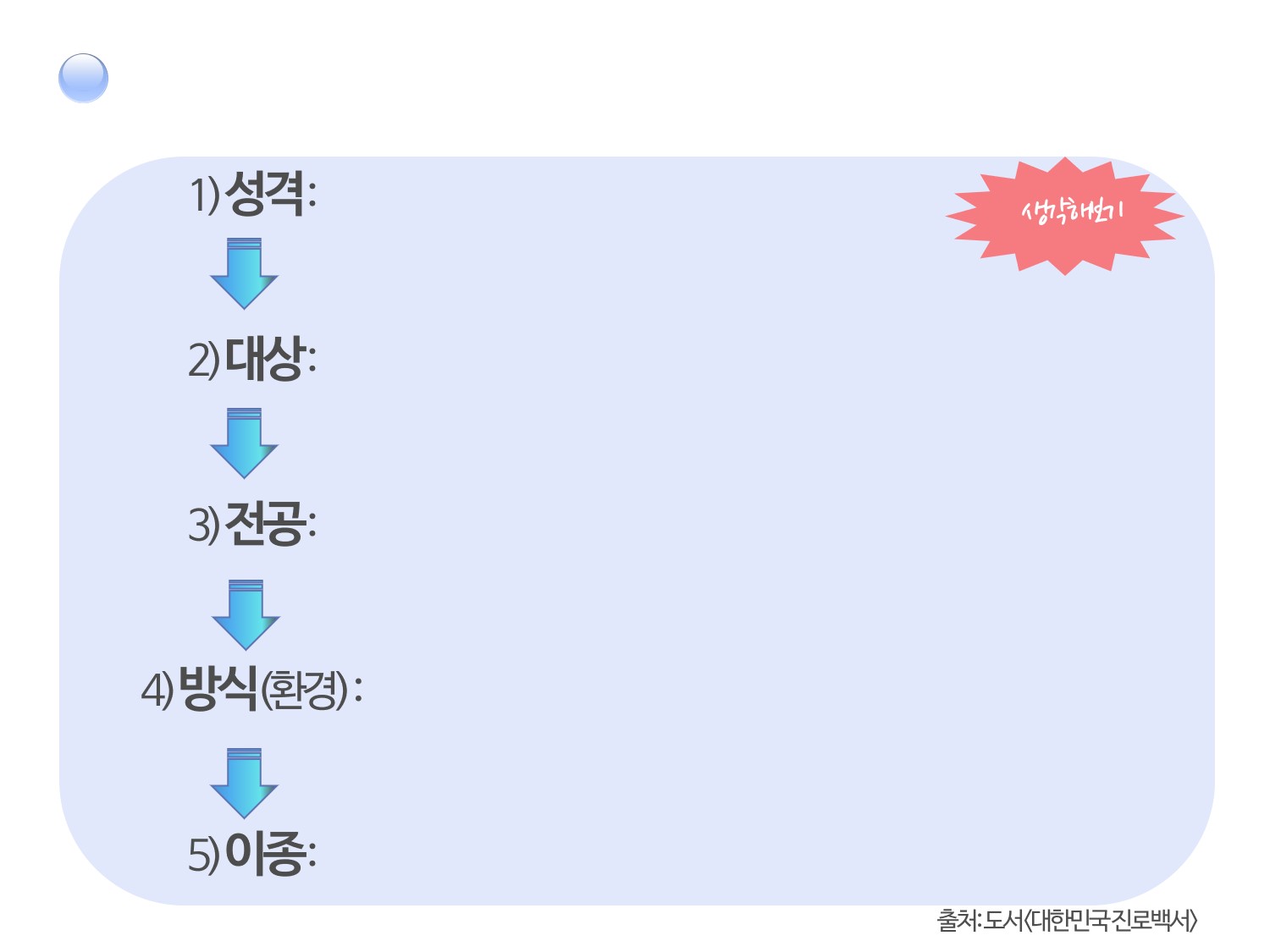 위의 예를 참고해 꿈꾸던 직업을 가질 수 없다고 안타까워할 것이 아니라 그 직업을 파고들어 어떻게 나만의 직업을 만들어낼 것인지 탐구해봐야 할 필요가 있다. 첫째는 희망하는 직업을 쓰고, 유관한 직업을 써본다.